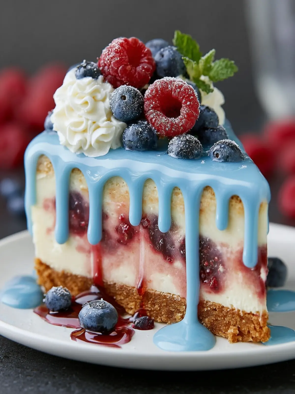 - Add the Topping: Once set, pour the blueberry glaze over the cheesecake, allowing it to drip over the edges. Decorate with fresh raspberries and edible blue flowers.