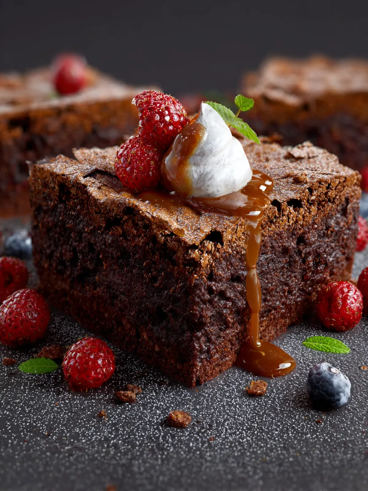 9. Slice the brownie cake and serve slightly warm or room temp, either naked or garnished with whipped cream, caramel sauce, and chocolate shavings, if desired.