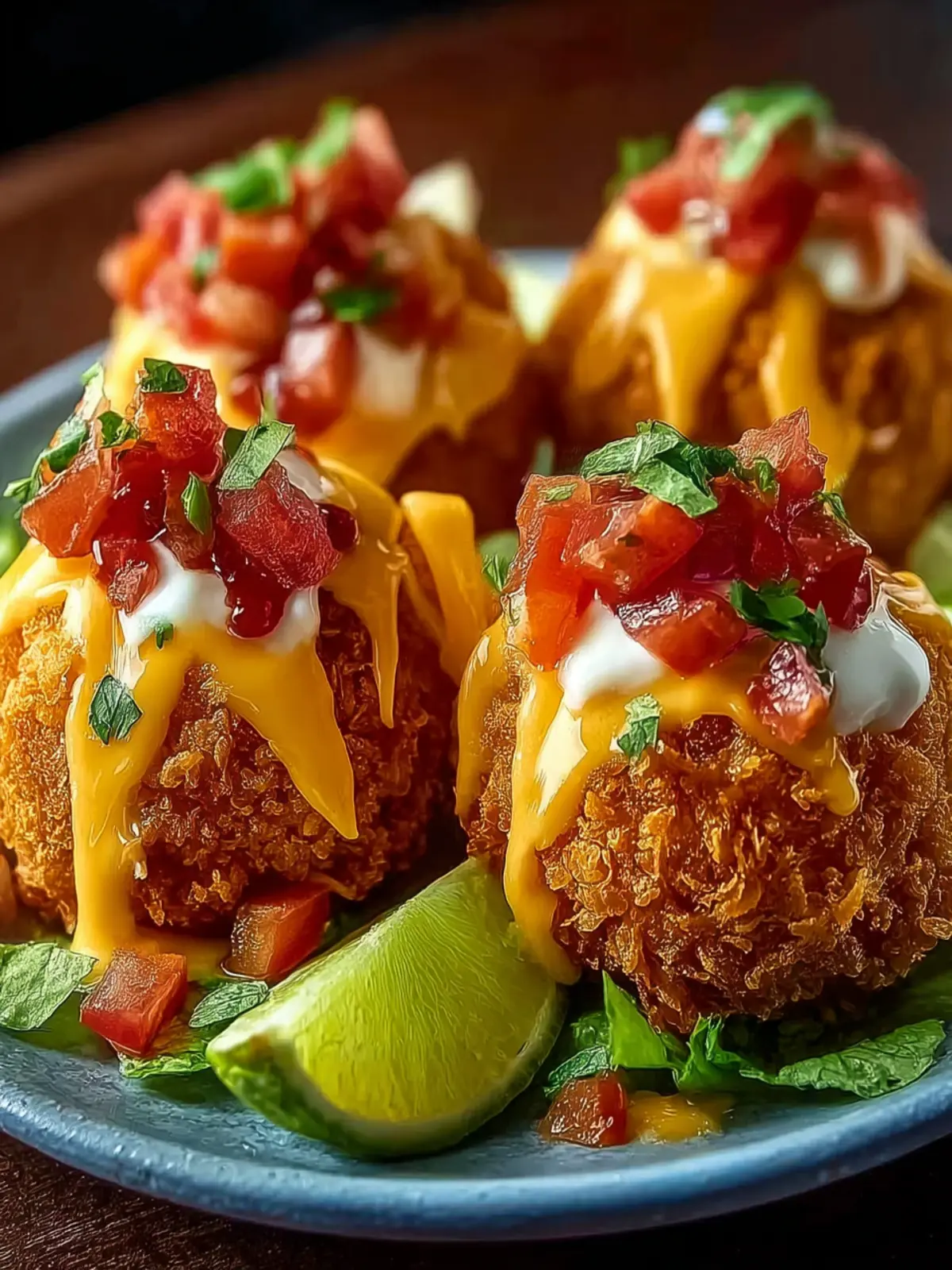 Delicious cheese-stuffed taco balls that are fried to golden perfection and served with sour cream, salsa, and guacamole.