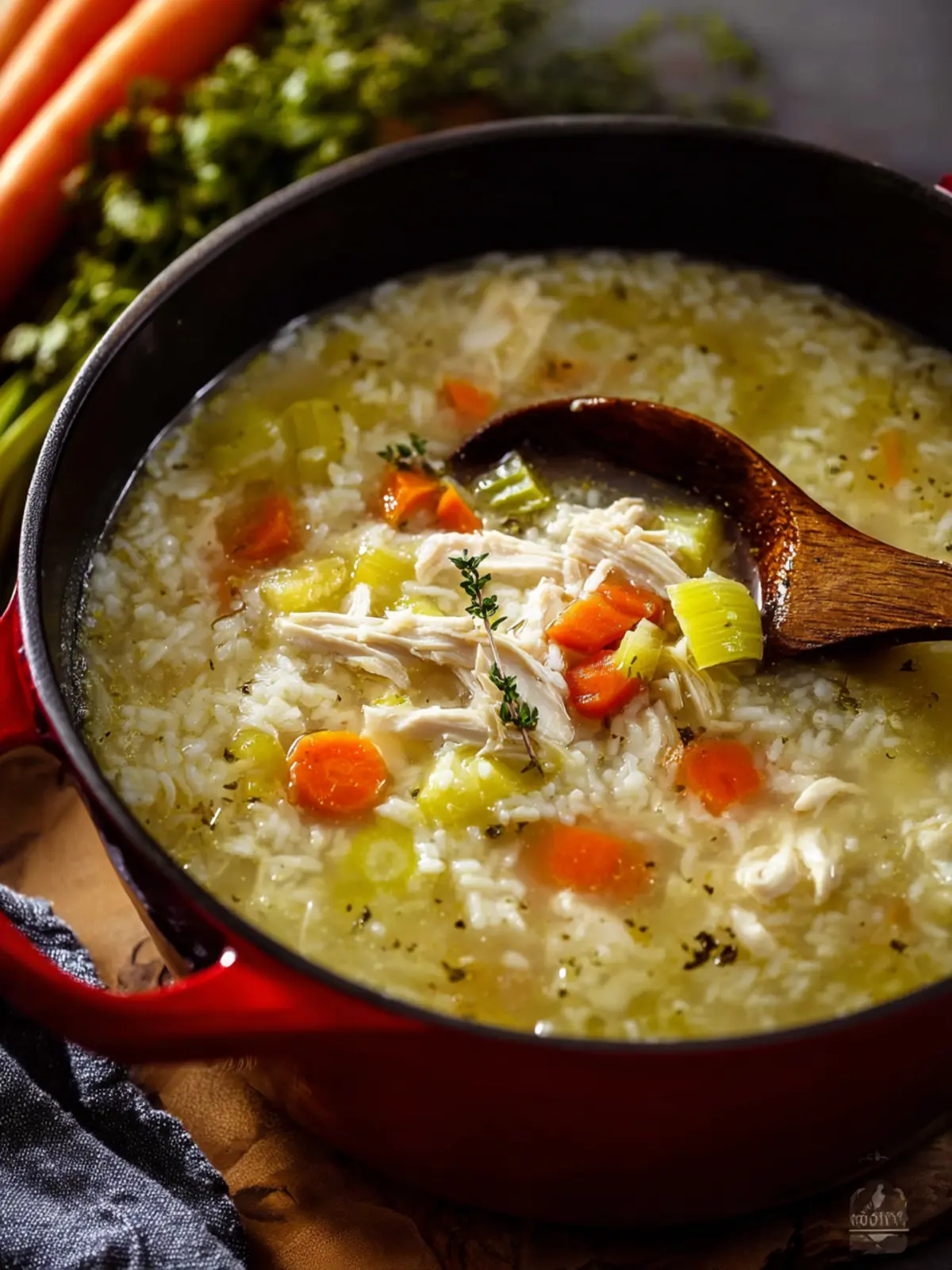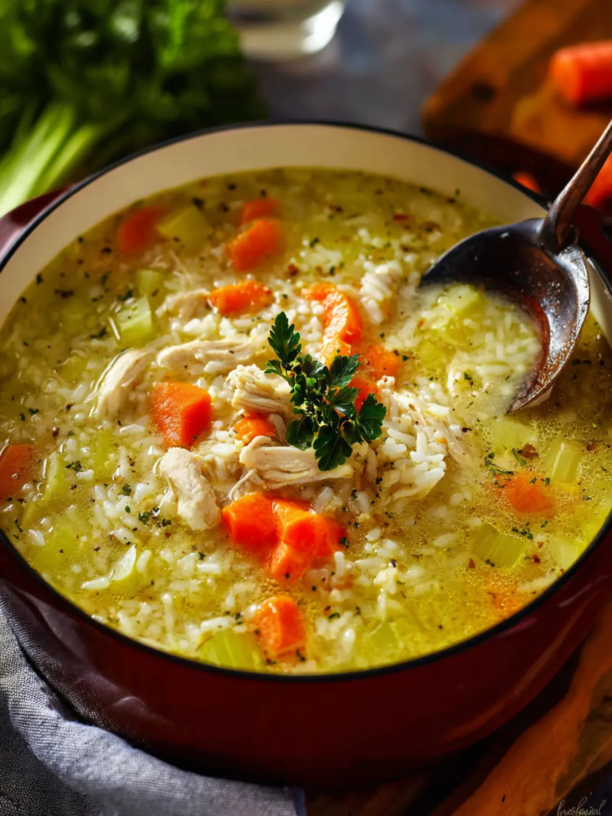 A comforting chicken and rice soup that is perfect for a cozy dinner.