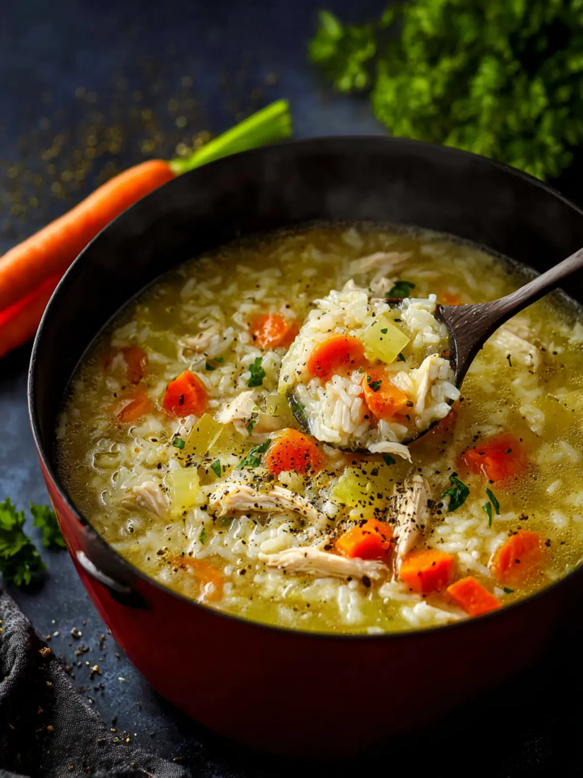 Health Benefits: With lean protein from the chicken, nourishing vitamins from the vegetables, and wholesome grains from the rice, this soup not only delights the palate but also supports your well-being.