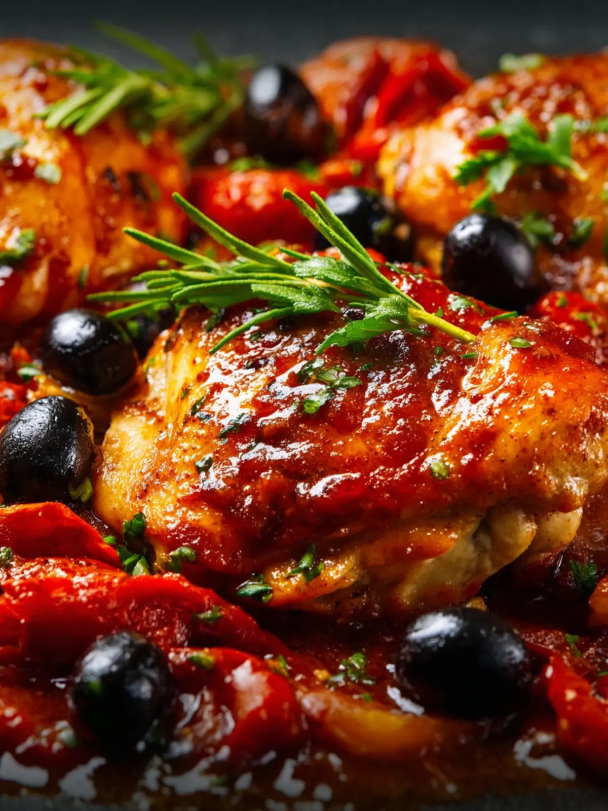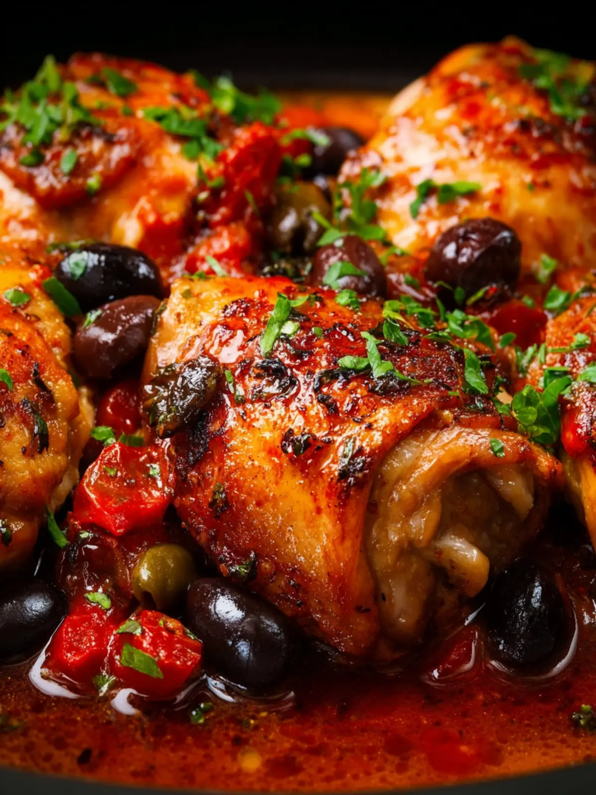 Delicious baked chicken thighs cooked in a savory tomato sauce with olives and anchovies.