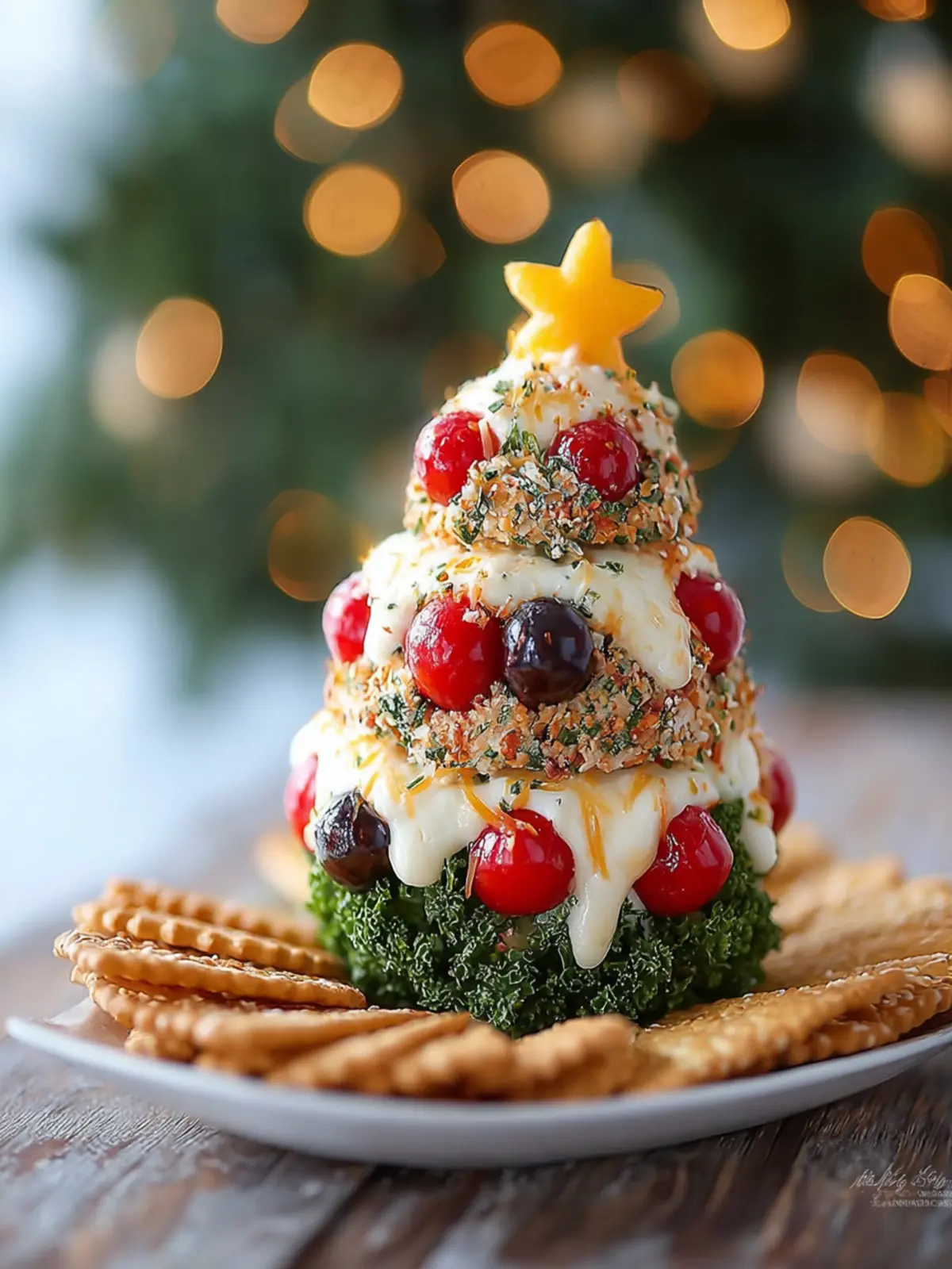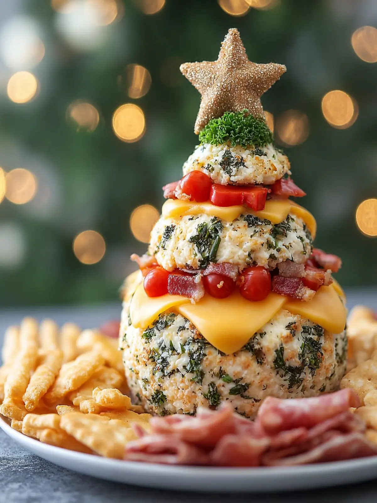 A festive and delicious cheese ball shaped like a Christmas tree, perfect for gatherings and parties!