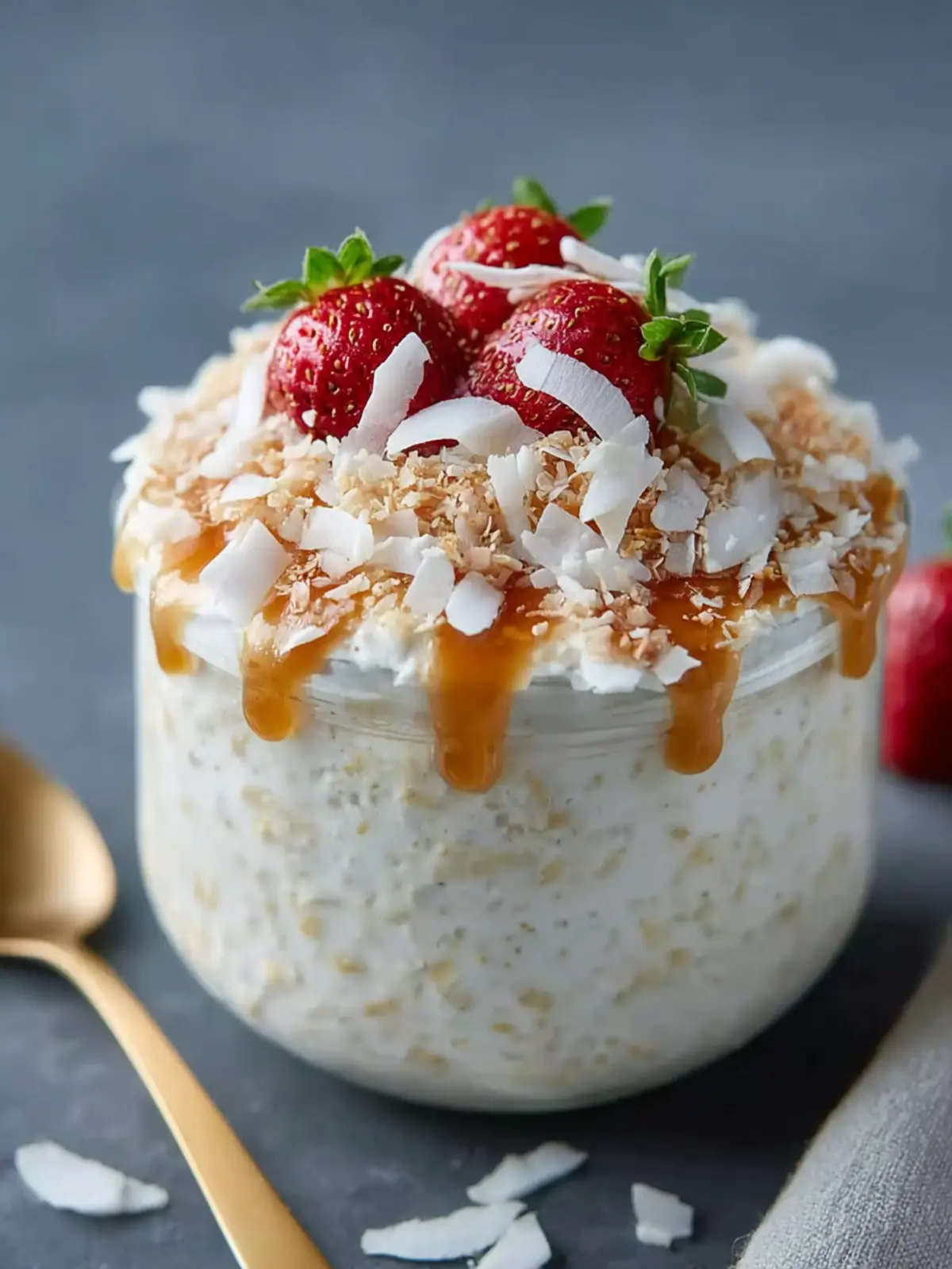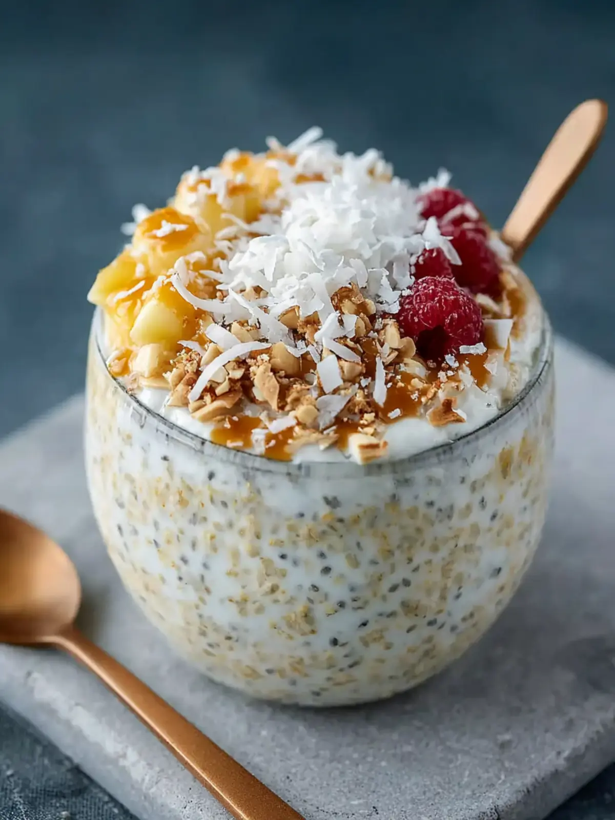 - Serve and enjoy: In the morning, give the oats a stir. Top with fresh fruit like pineapple chunks, diced mango, or strawberries. You can also sprinkle a bit more shredded coconut or a few nuts for crunch.