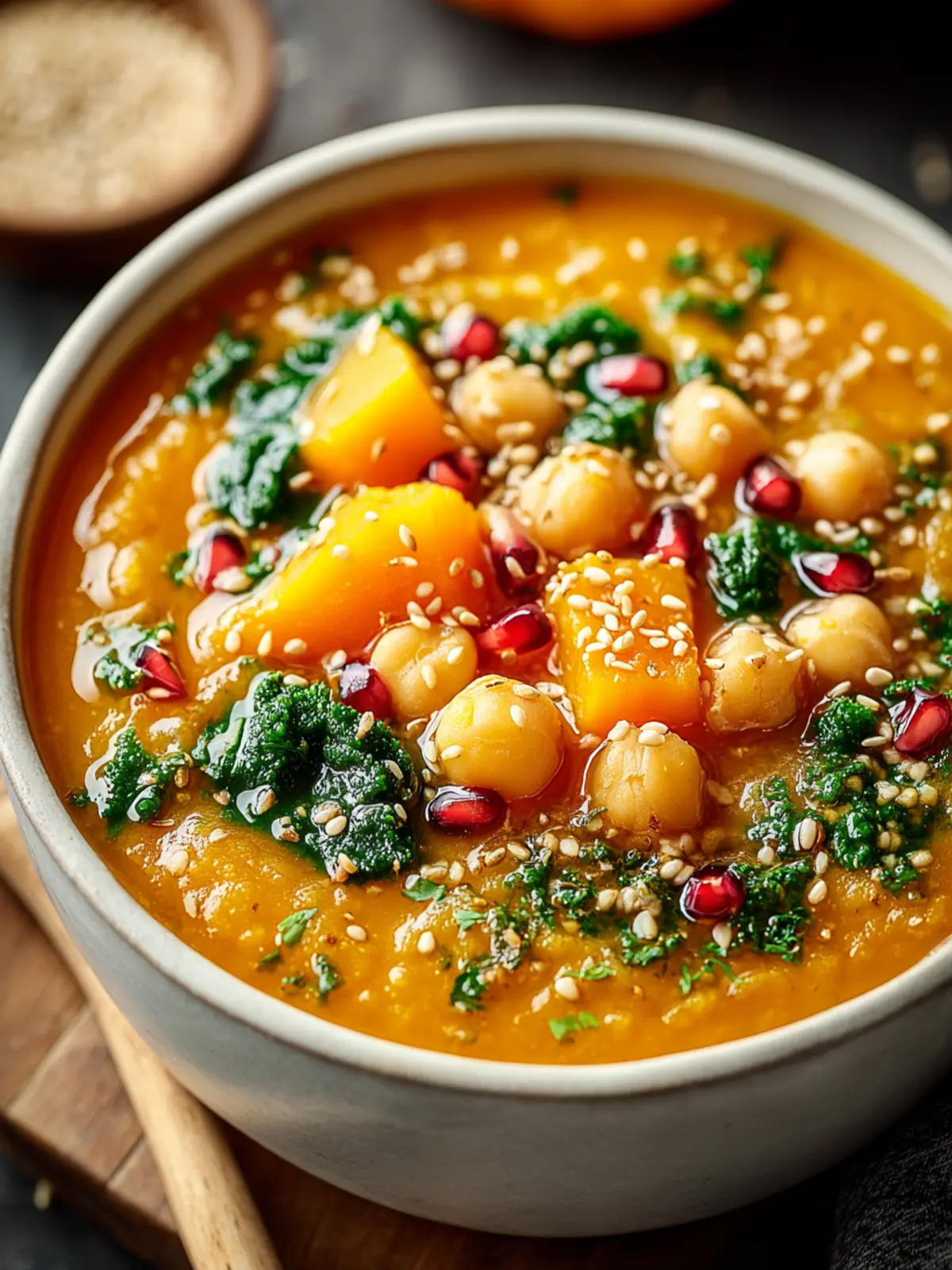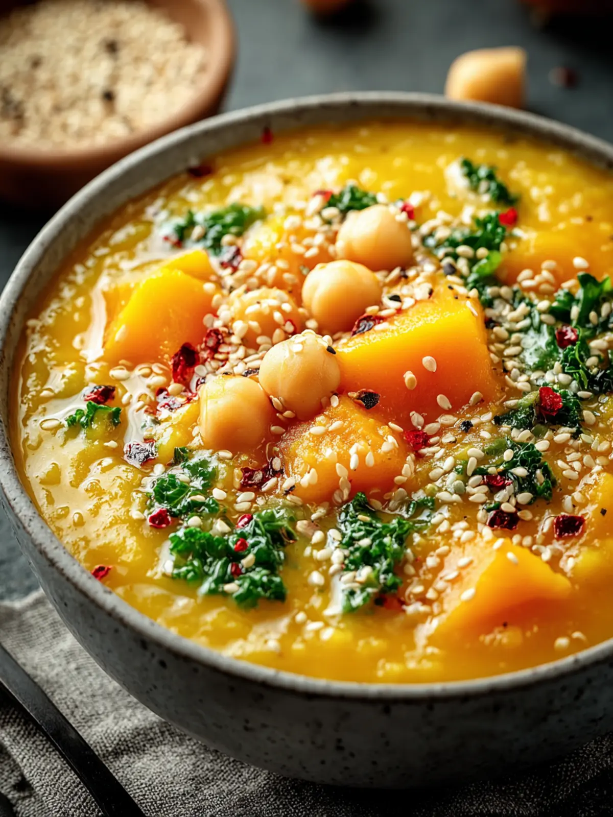 A delicious and creamy kabocha squash soup enriched with chickpeas and miso paste, perfect for warming up on a cold day.