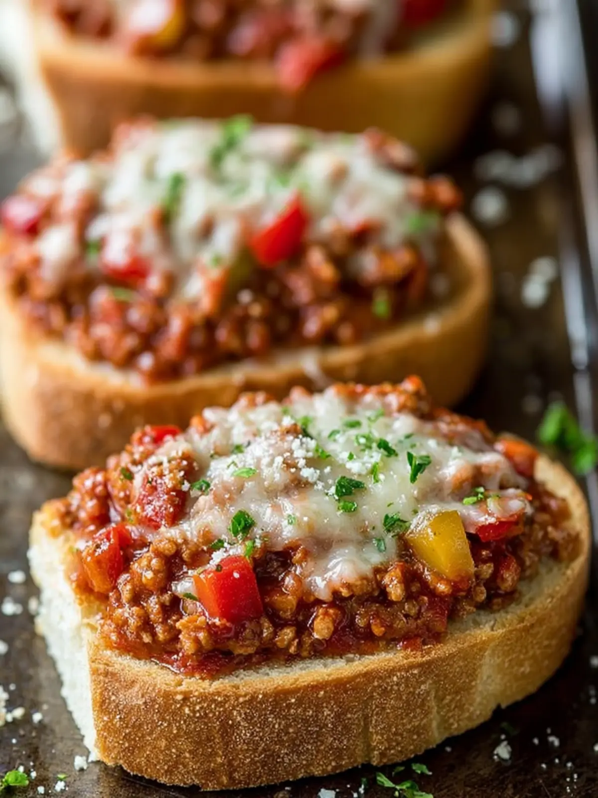 Delicious Italian sausage garlic bread topped with melted cheese and bell peppers.