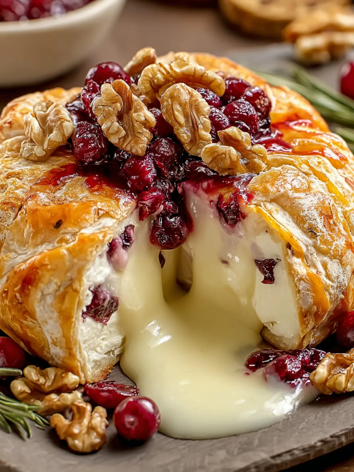 A delicious baked Brie topped with cranberries and walnuts, perfect for entertaining.