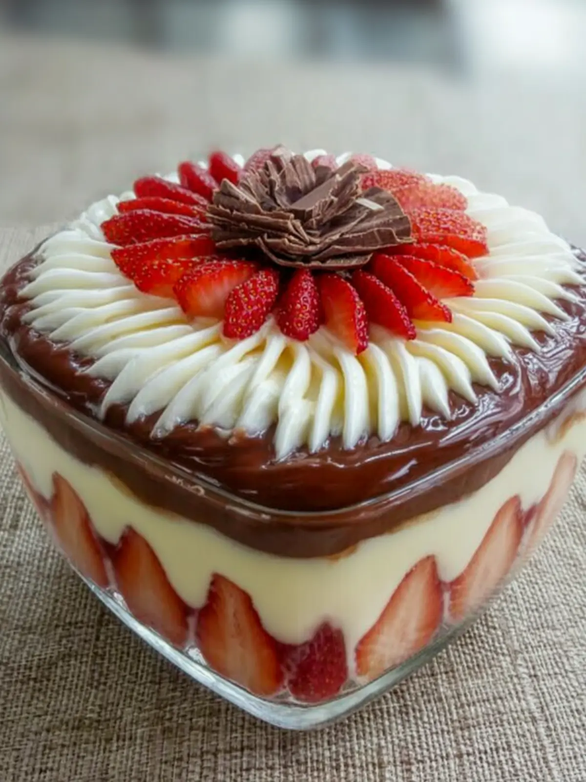 A deliciously layered dessert featuring chocolate cake, fresh strawberries, chocolate ganache, and vanilla custard.