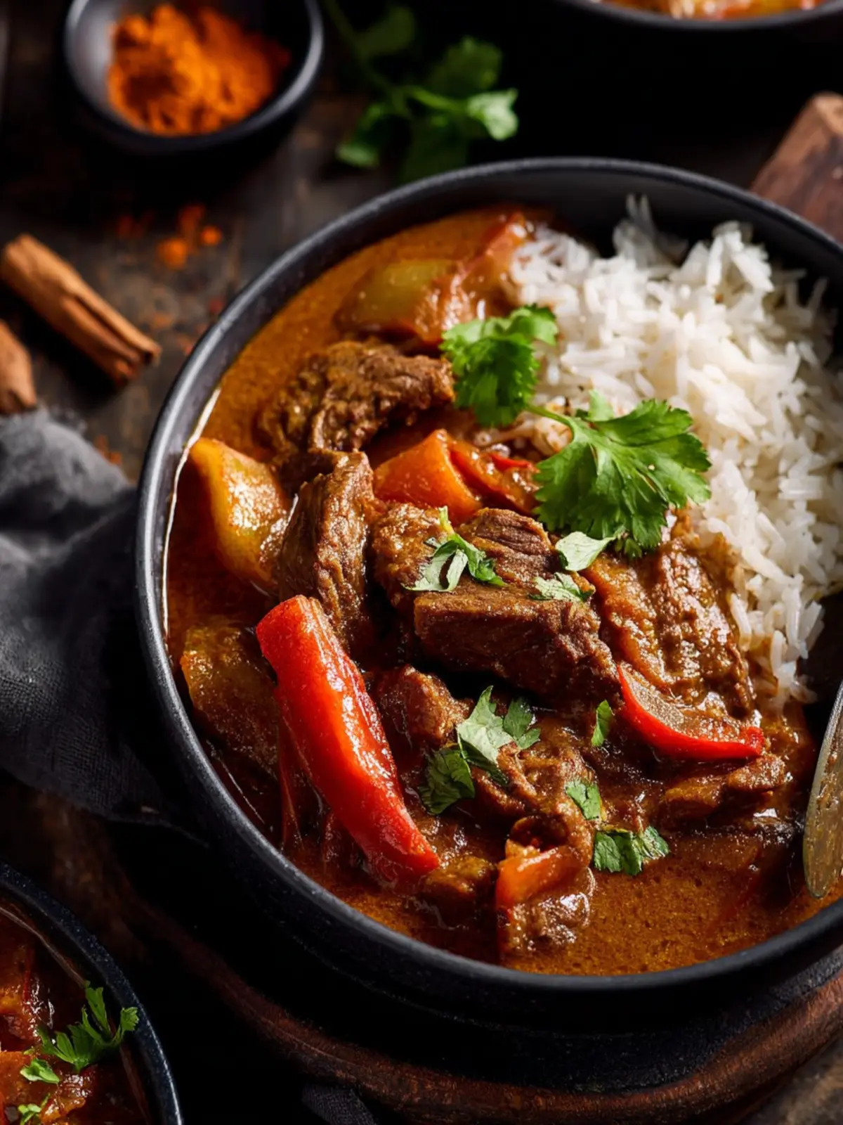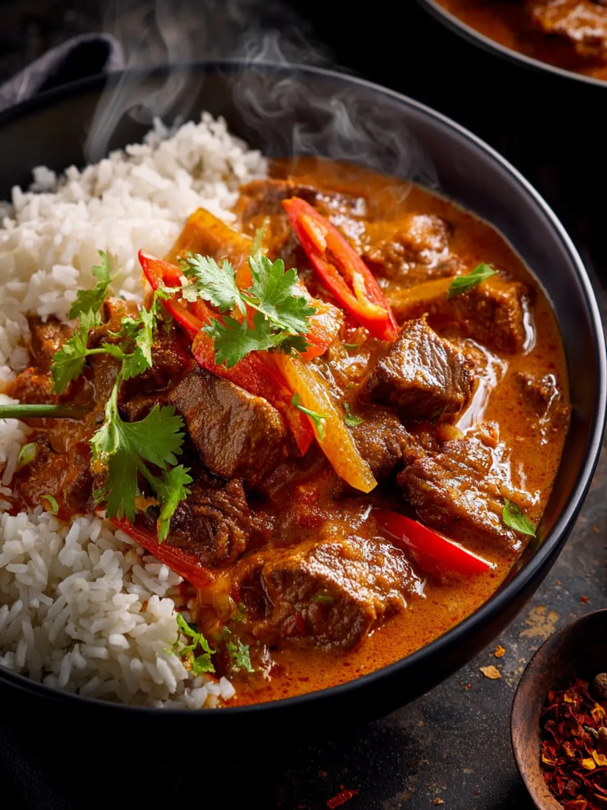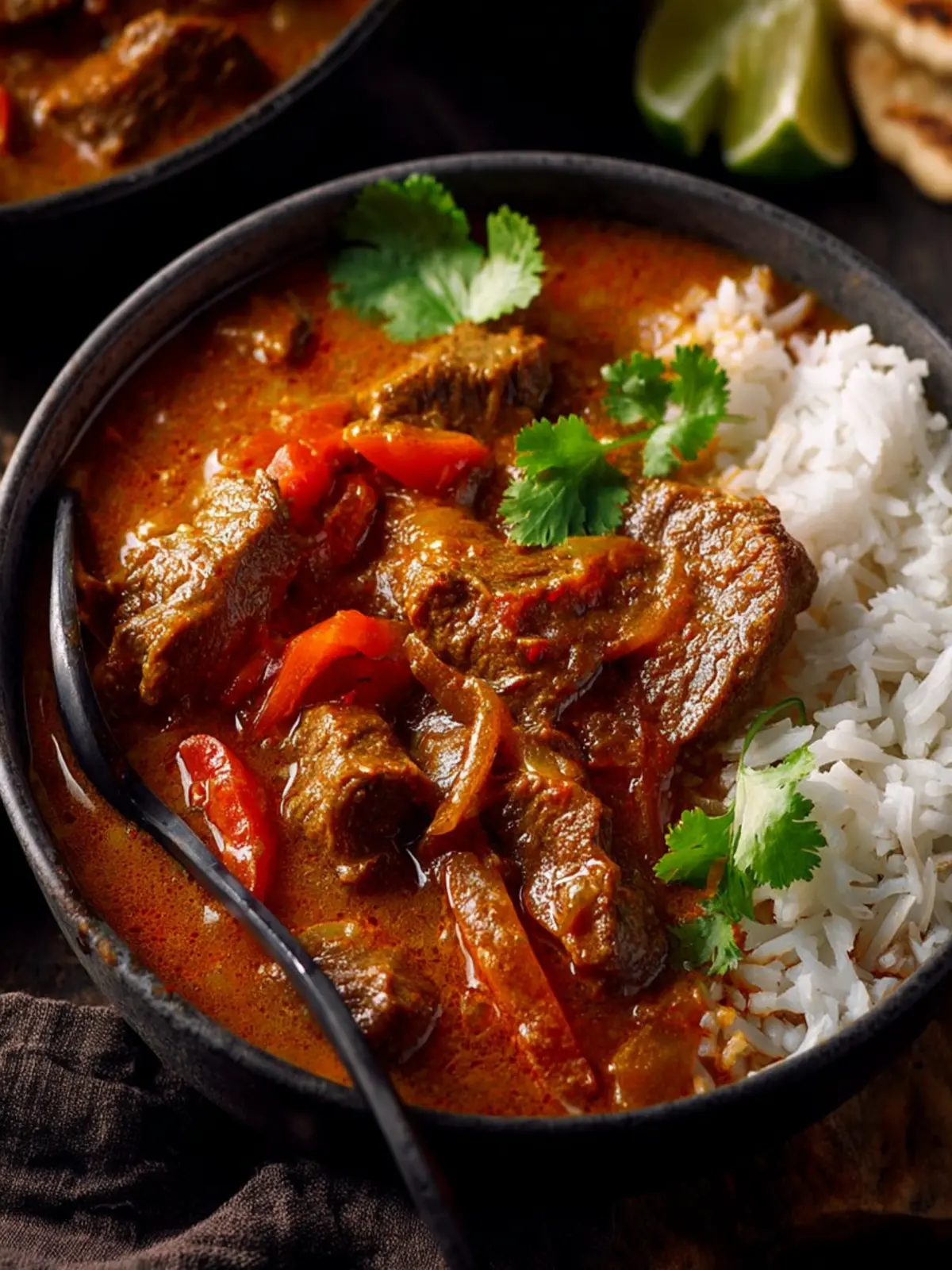 A delicious coconut cream steak curry with a blend of spices, perfect for serving with rice and poppadoms.