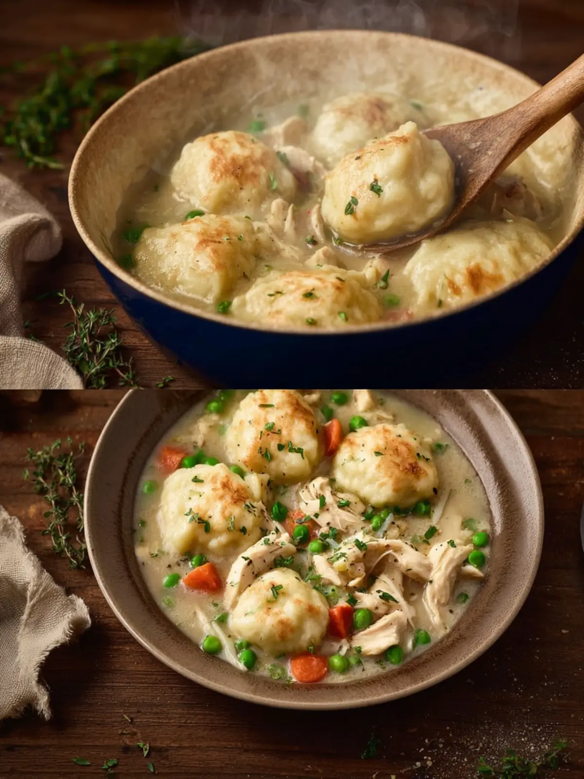 Dumplings: For the dumplings, I use a simple combination of flour, baking powder, and milk. They cook up fluffy and light, soaking up the delicious chicken and broth for a comforting bite. You can use fresh herbs to elevate their flavor.