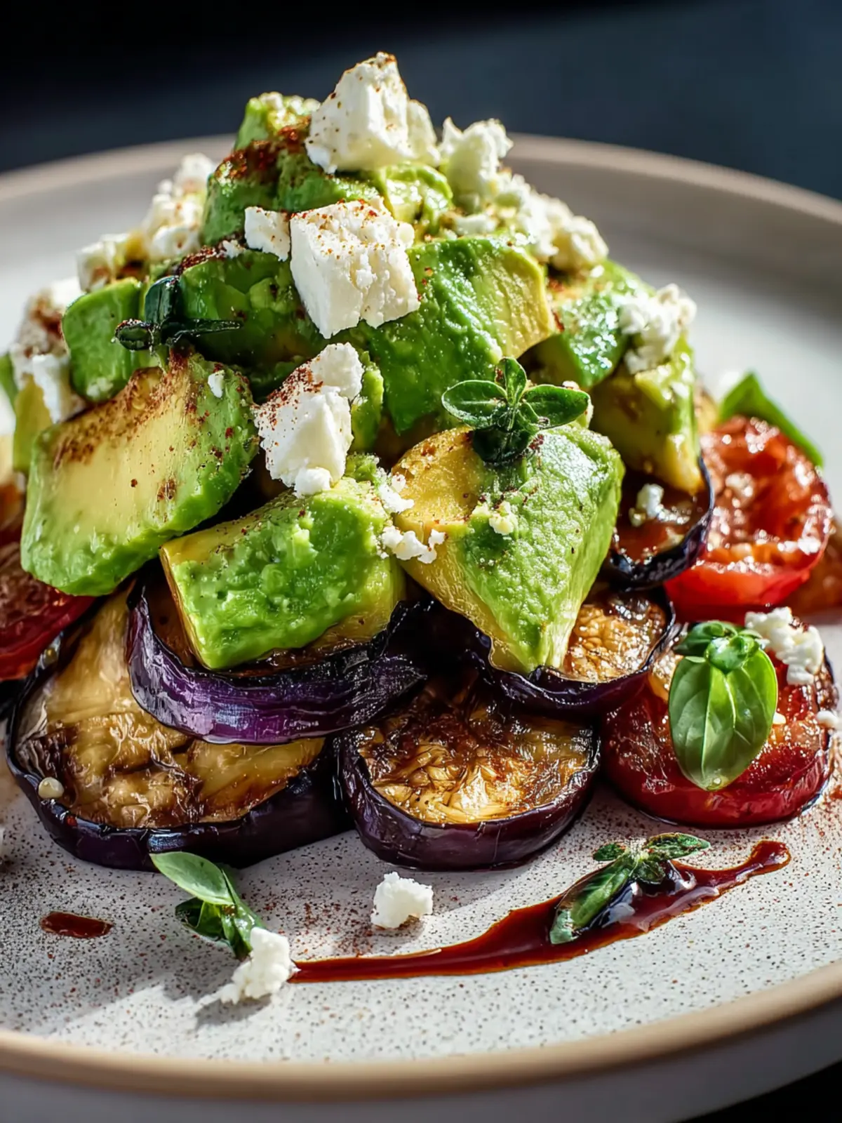 A refreshing salad featuring roasted eggplant and creamy avocado, mixed with colorful vegetables and a light dressing.