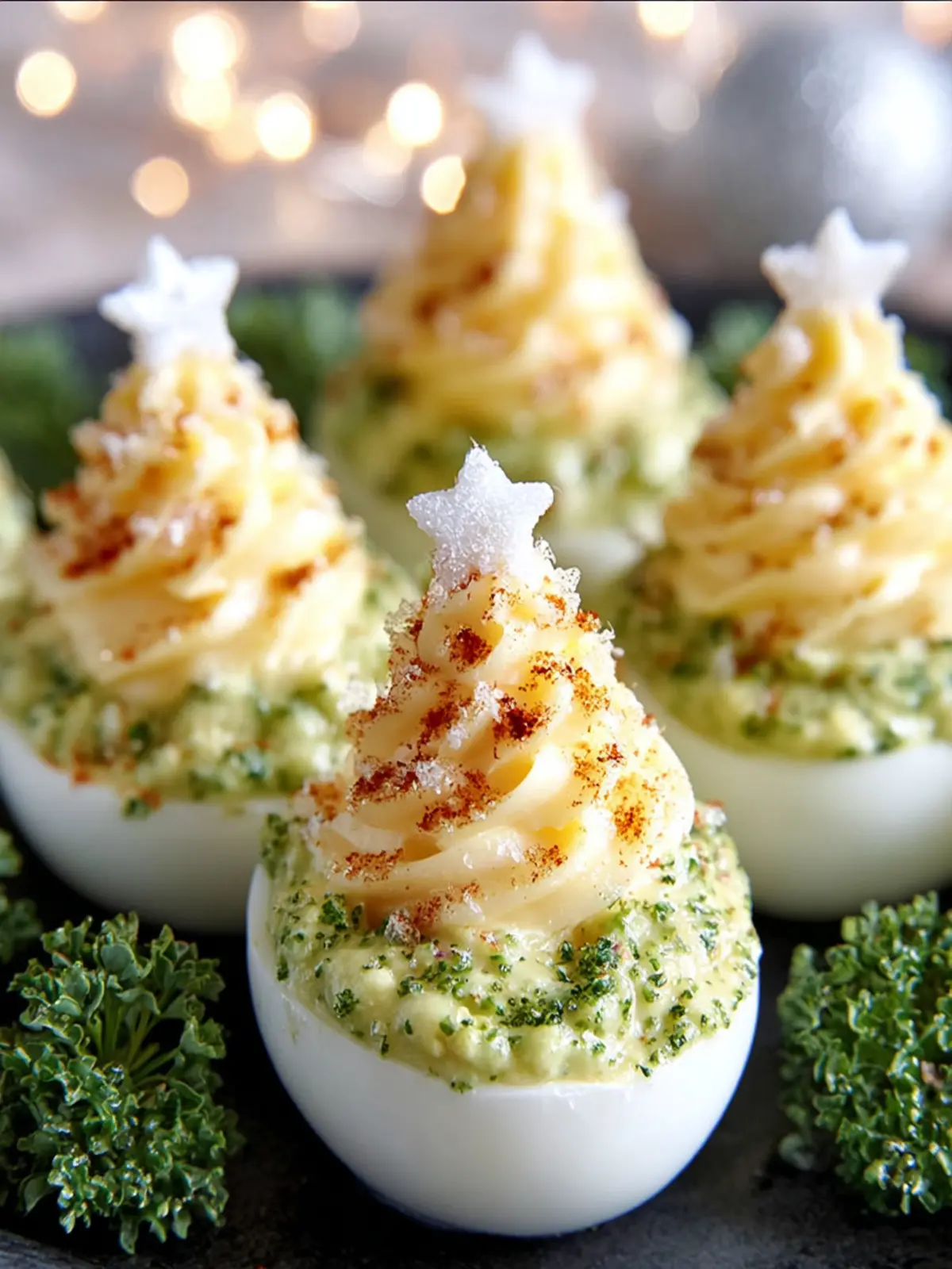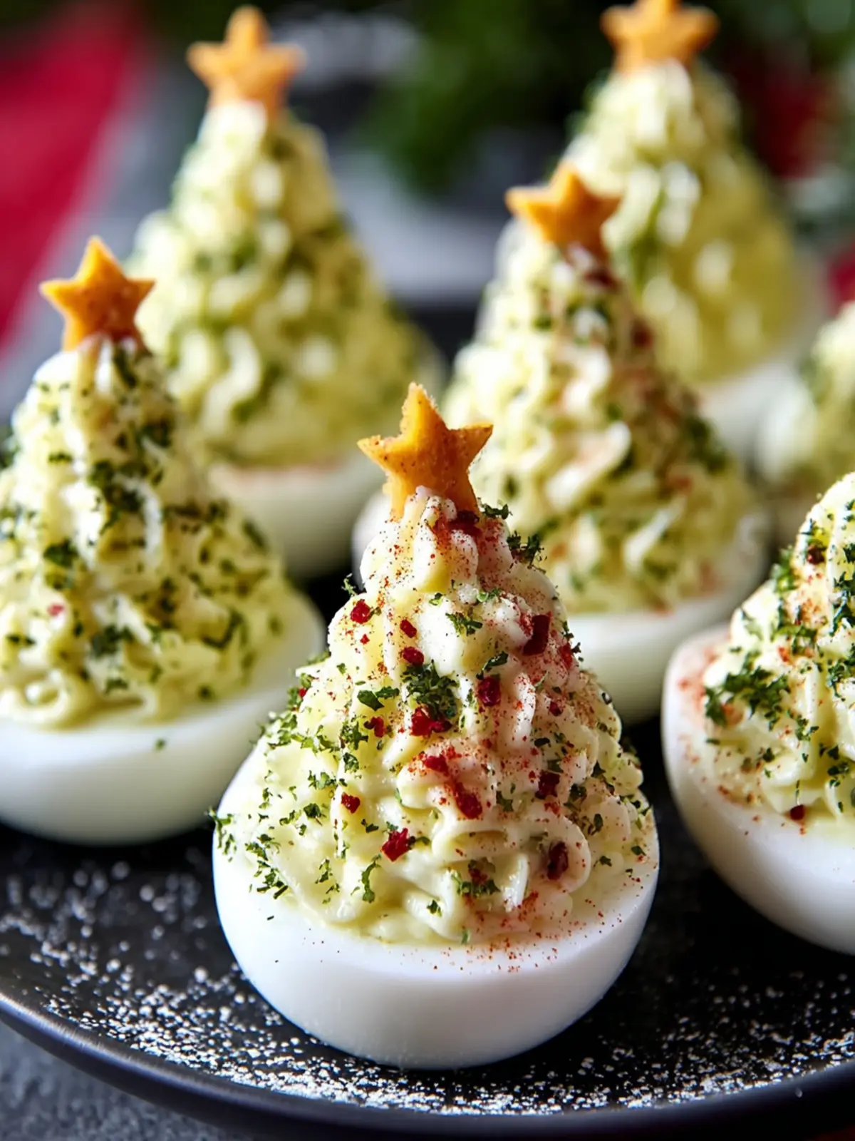 Visual Appeal: The playful design is simply too delightful to resist. Shaped to mimic a Christmas tree, these deviled eggs add a whimsical touch that captures the holiday spirit.