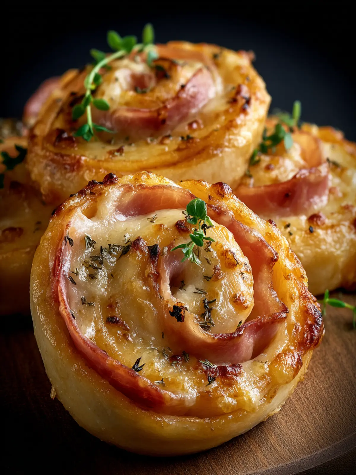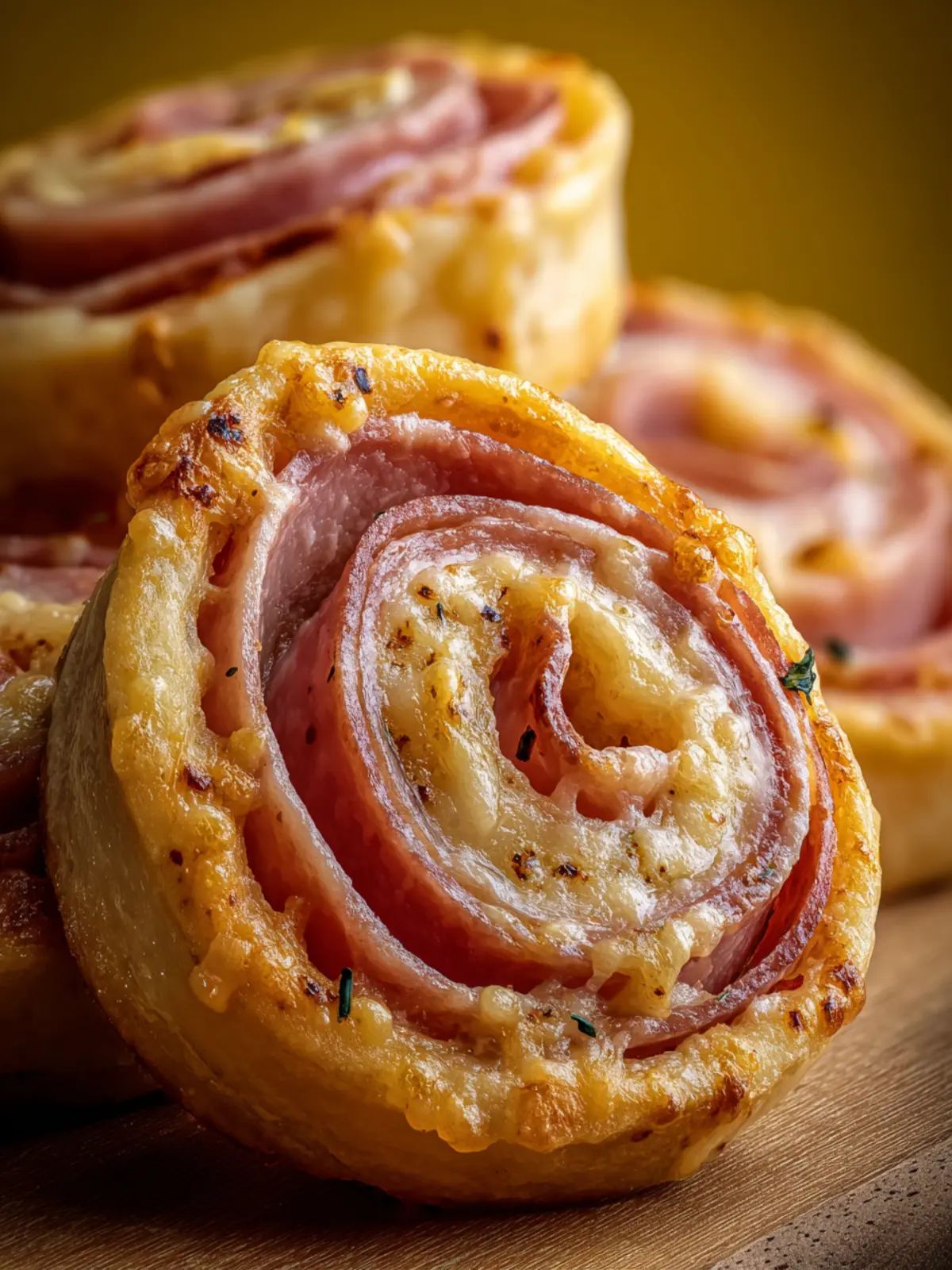 Delicious pinwheels made with puff pastry, deli ham, and cheese, perfect for any gathering.