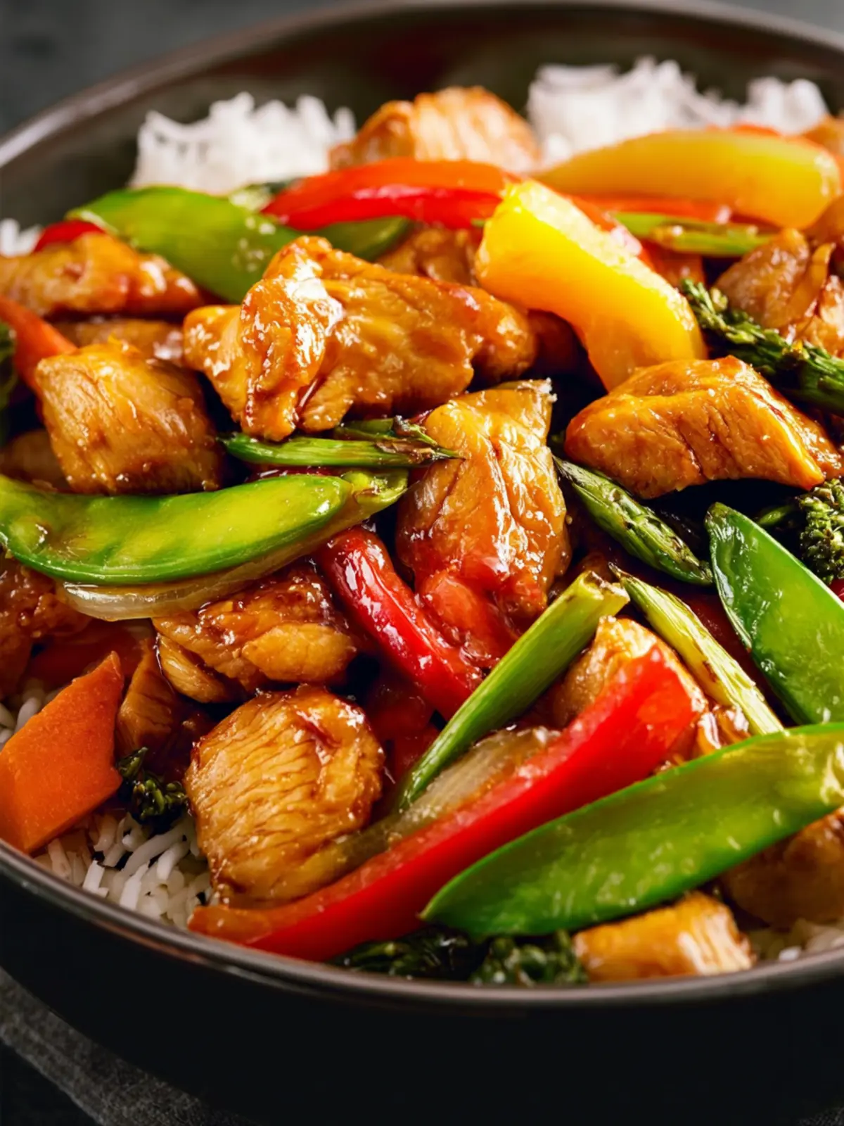 A delicious sesame chicken stir fry made with fresh vegetables and a flavorful sauce.