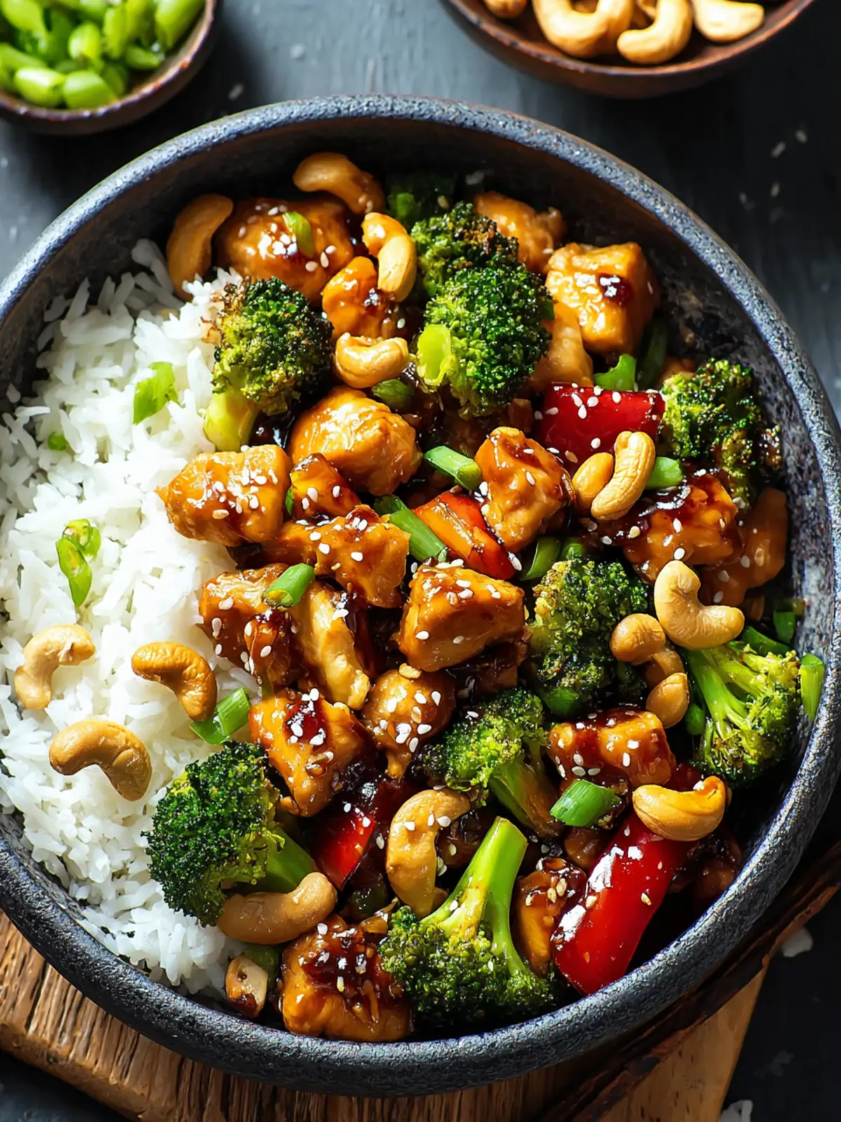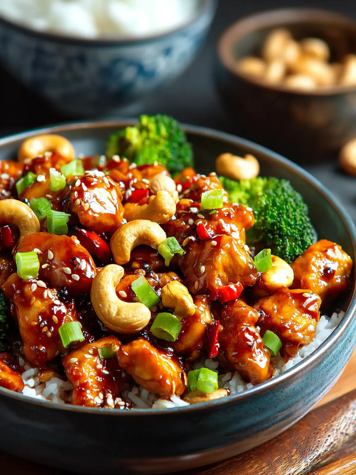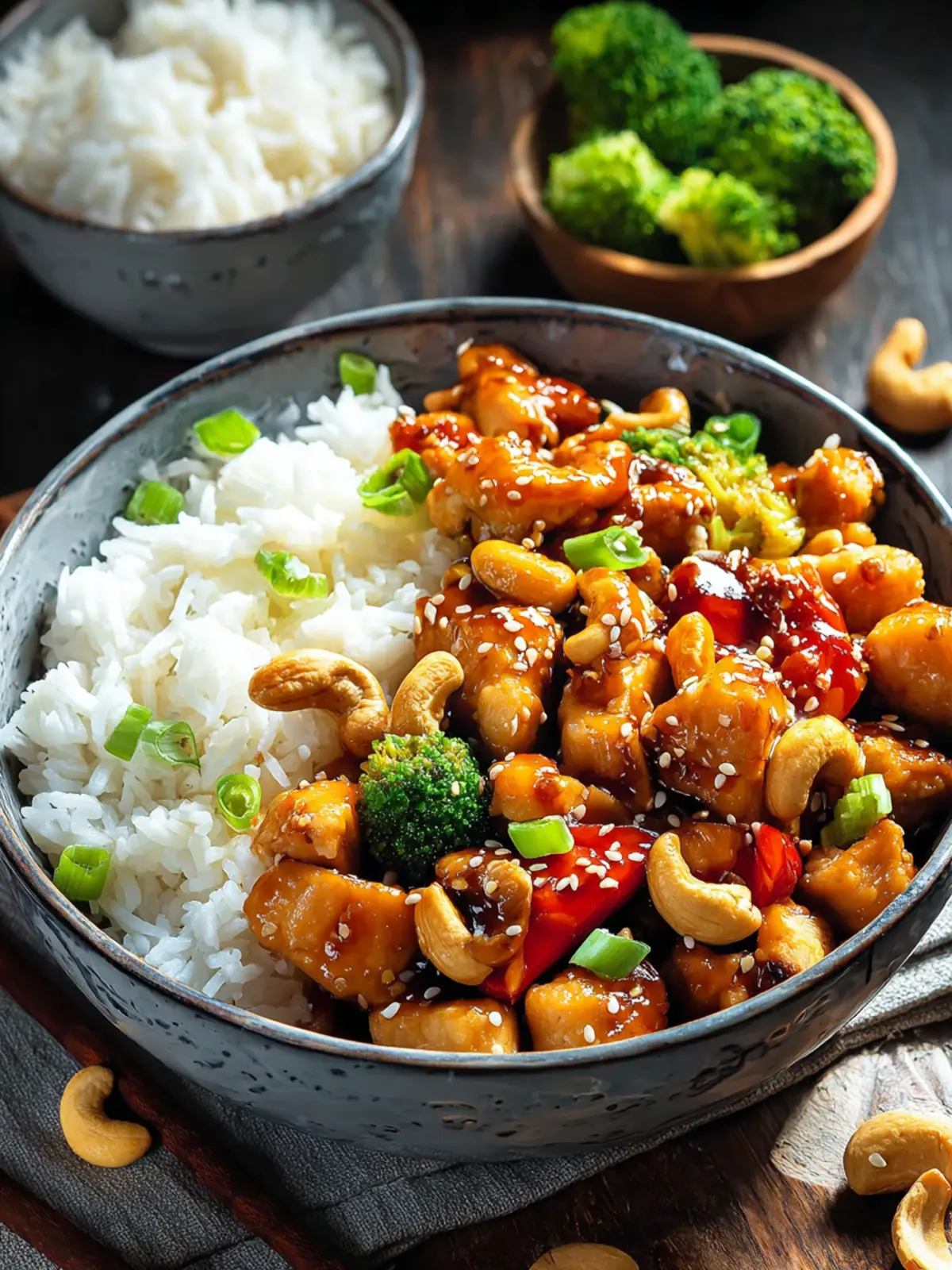Fresh, Flavorful Ingredients: With vibrant vegetables, zesty ginger, and succulent chicken, every bite bursts with flavor. The crunchy cashews not only elevate the texture but also add a delightful nuttiness that complements the sweetness of the sauce beautifully.