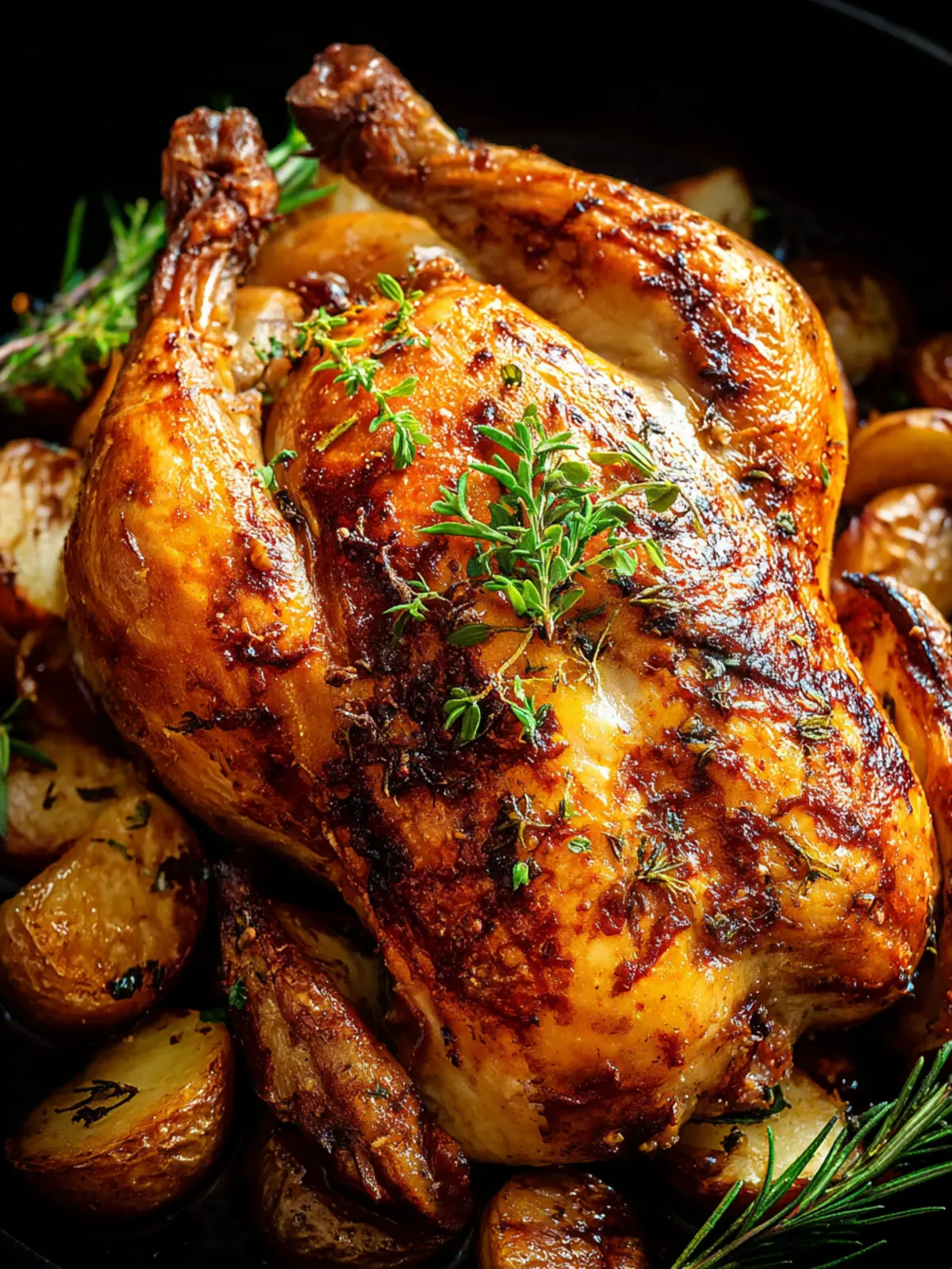 - Rub olive oil all over the chicken and season generously with salt, pepper, rosemary, and thyme.