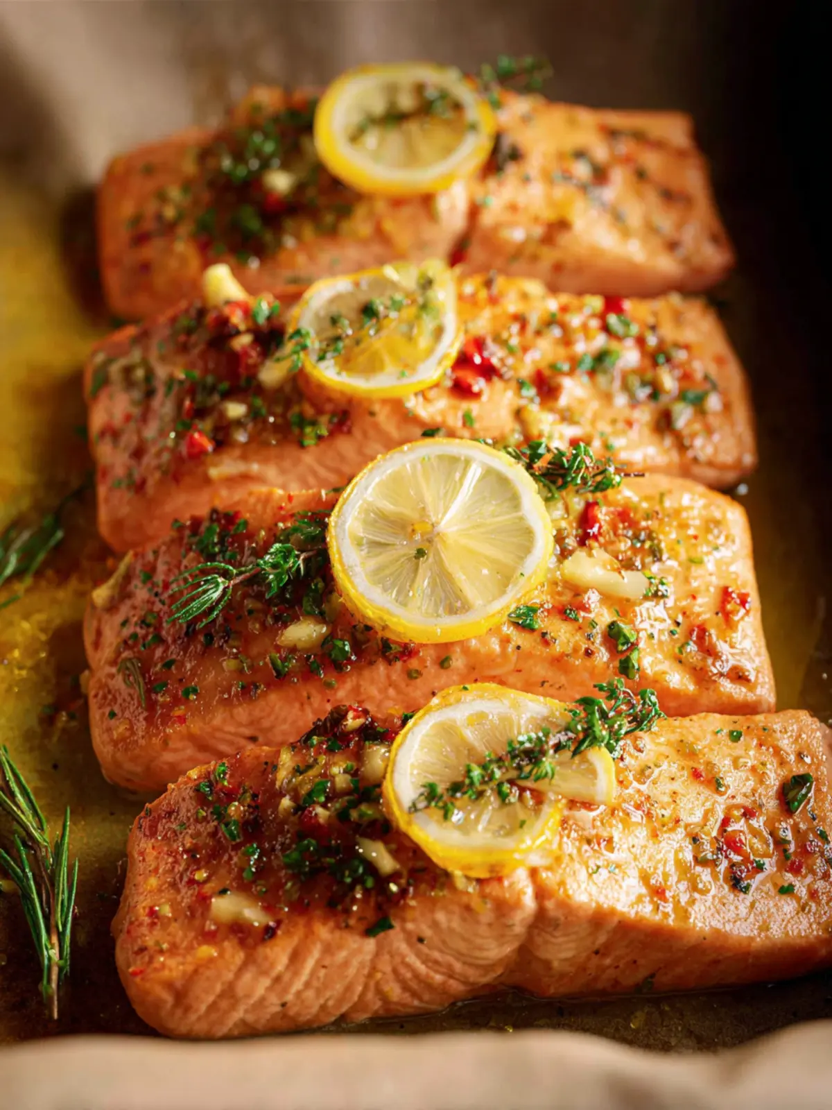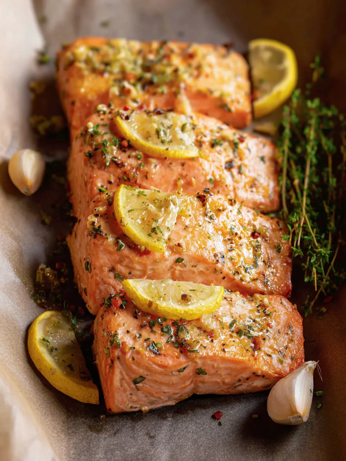 Delicious baked salmon fillets topped with a flavorful garlic lemon butter and fresh herbs.