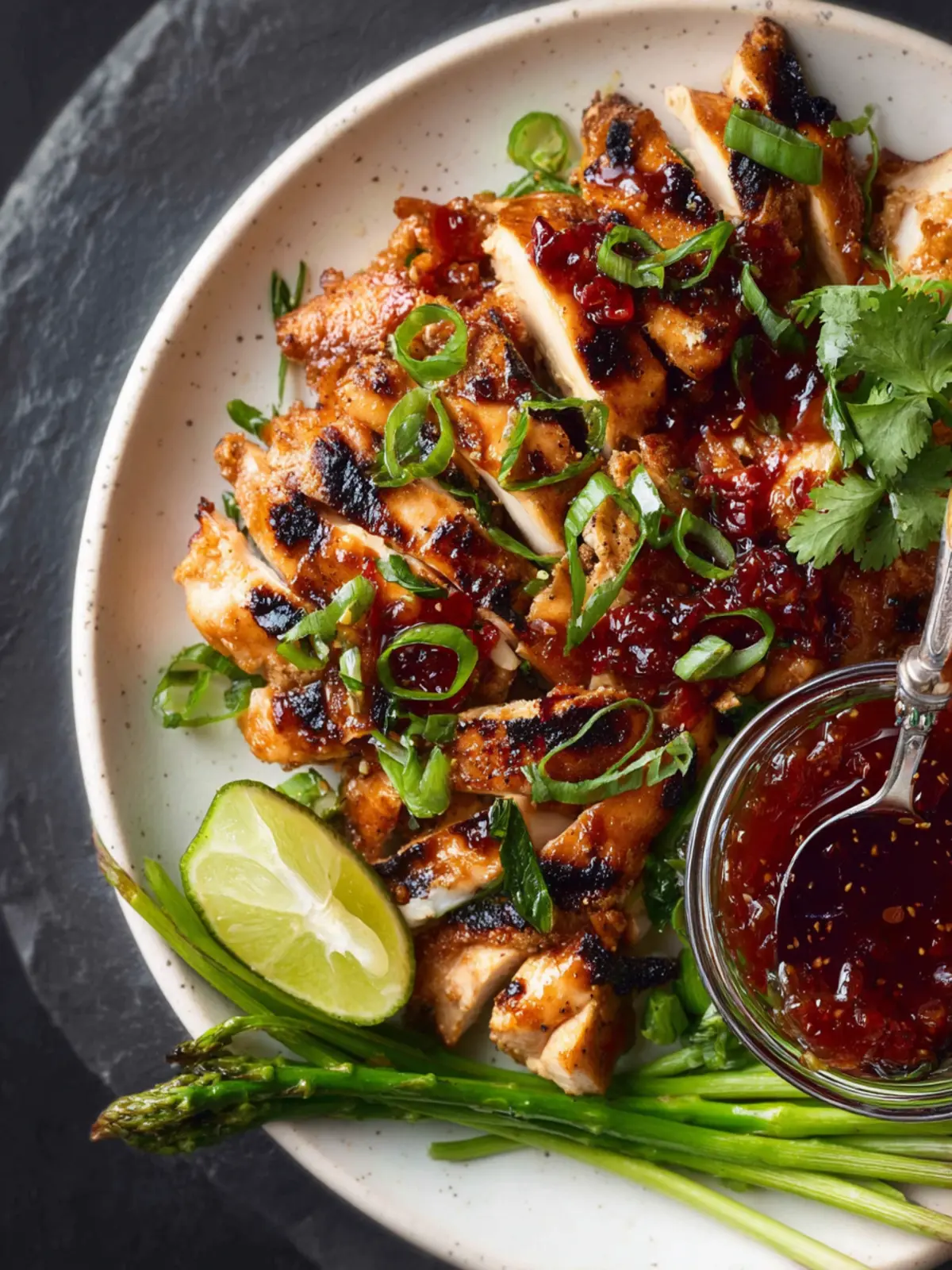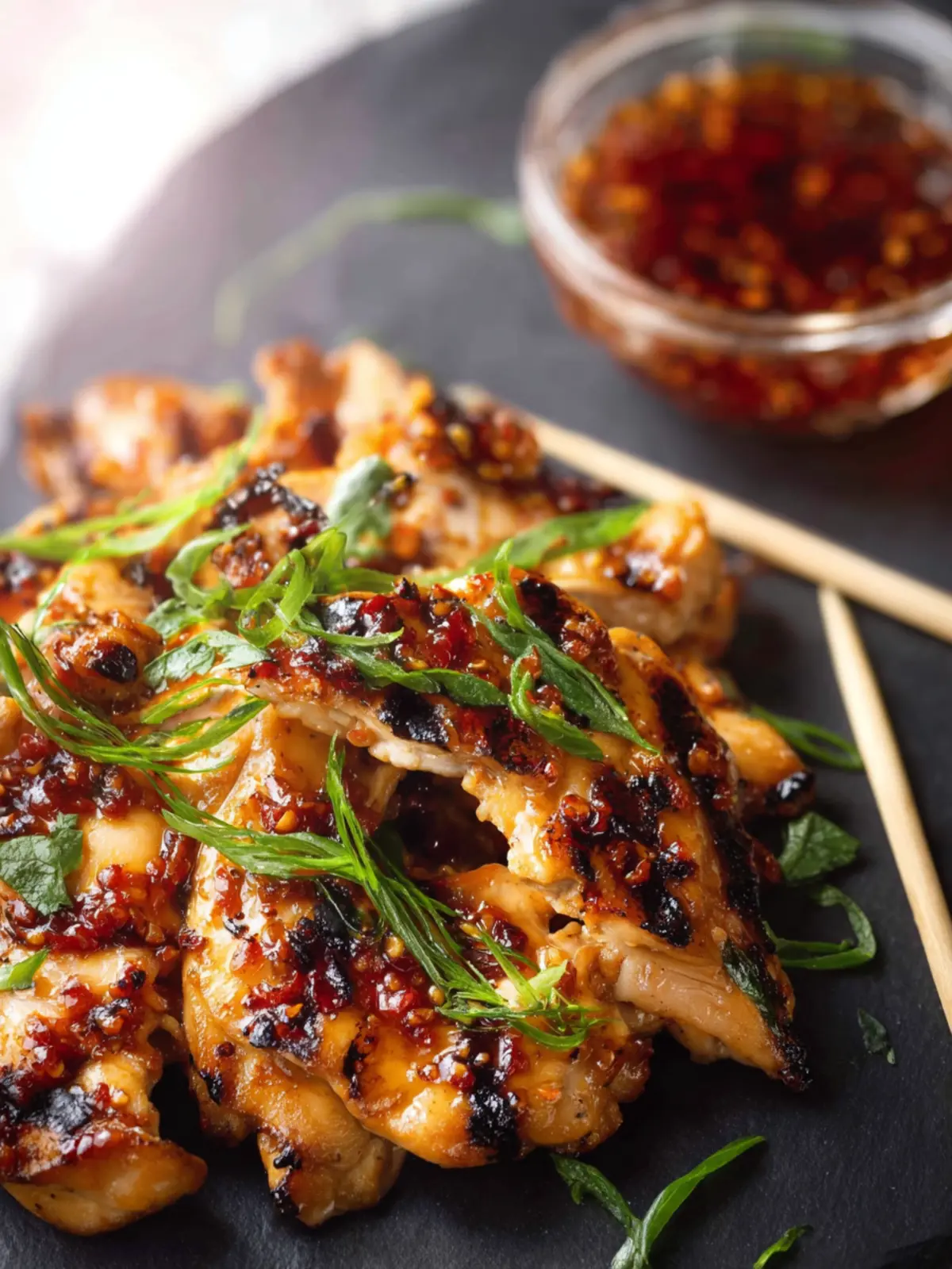 - Let the chicken rest for five minutes before slicing. Serve it on a plate, topped with scallion, cilantro, chili jam, and sesame seeds.