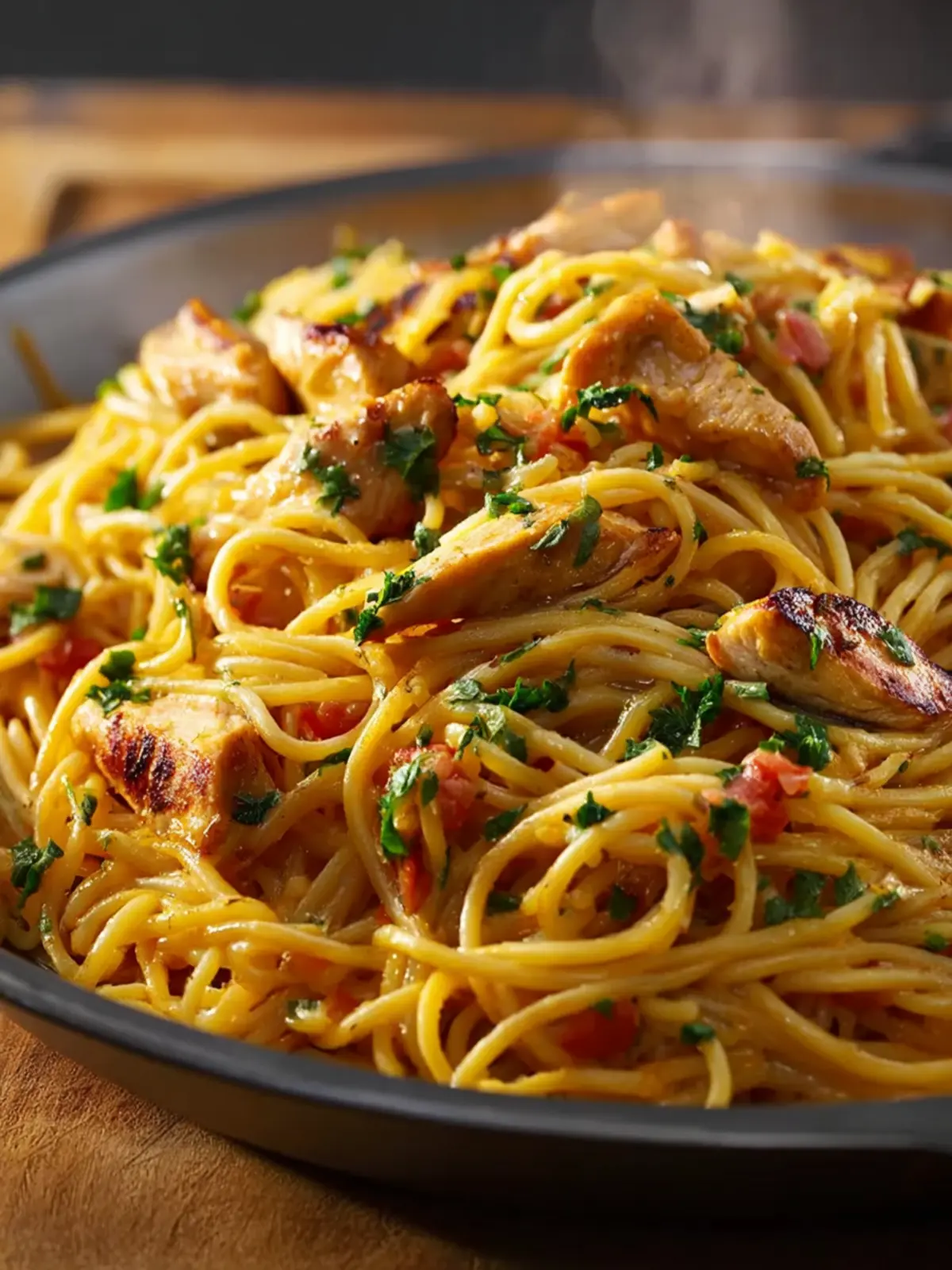 - Combine Chicken and Pasta: Stir in the cooked chicken and cooked spaghetti until everything is evenly coated with the creamy sauce.