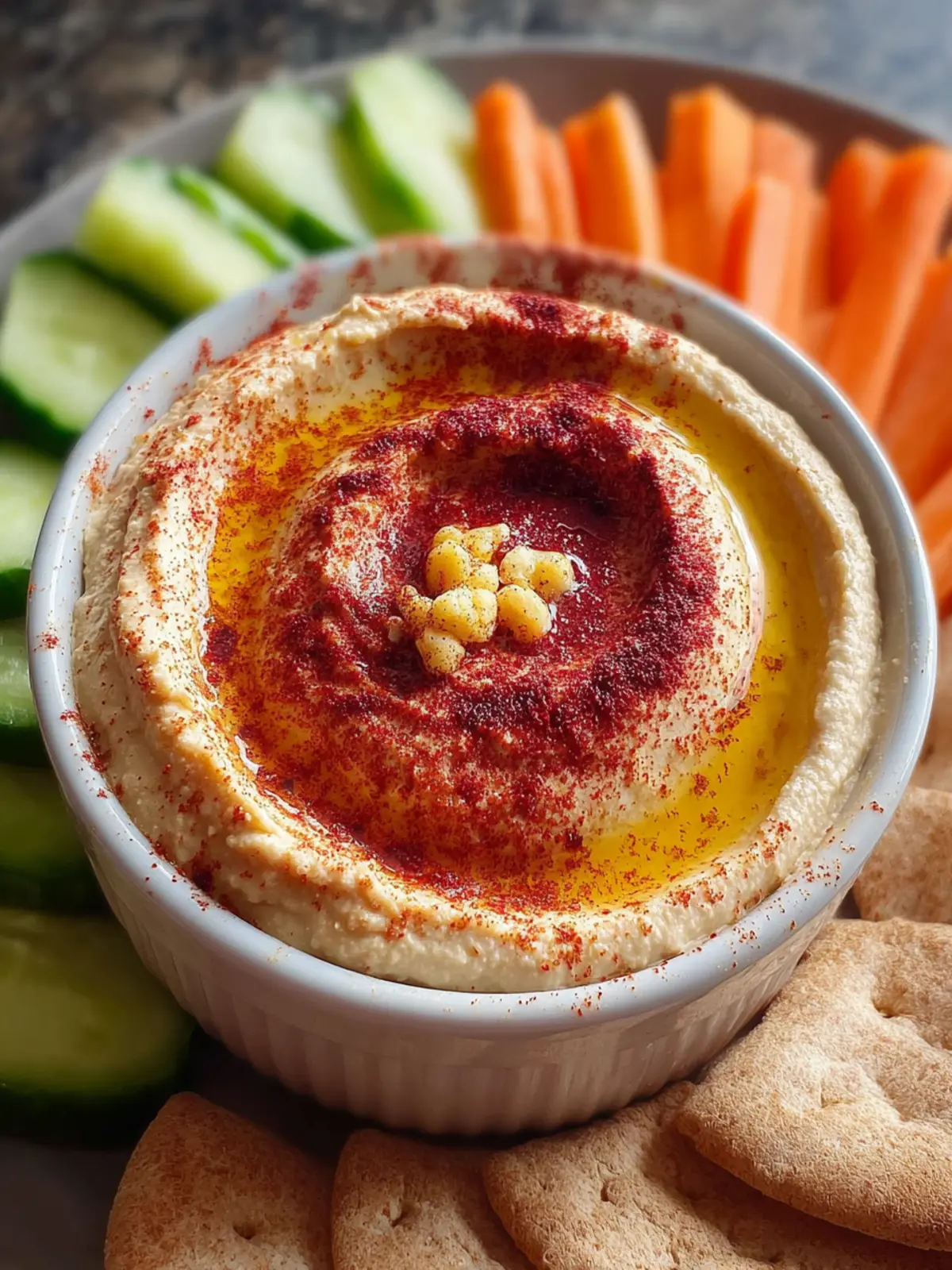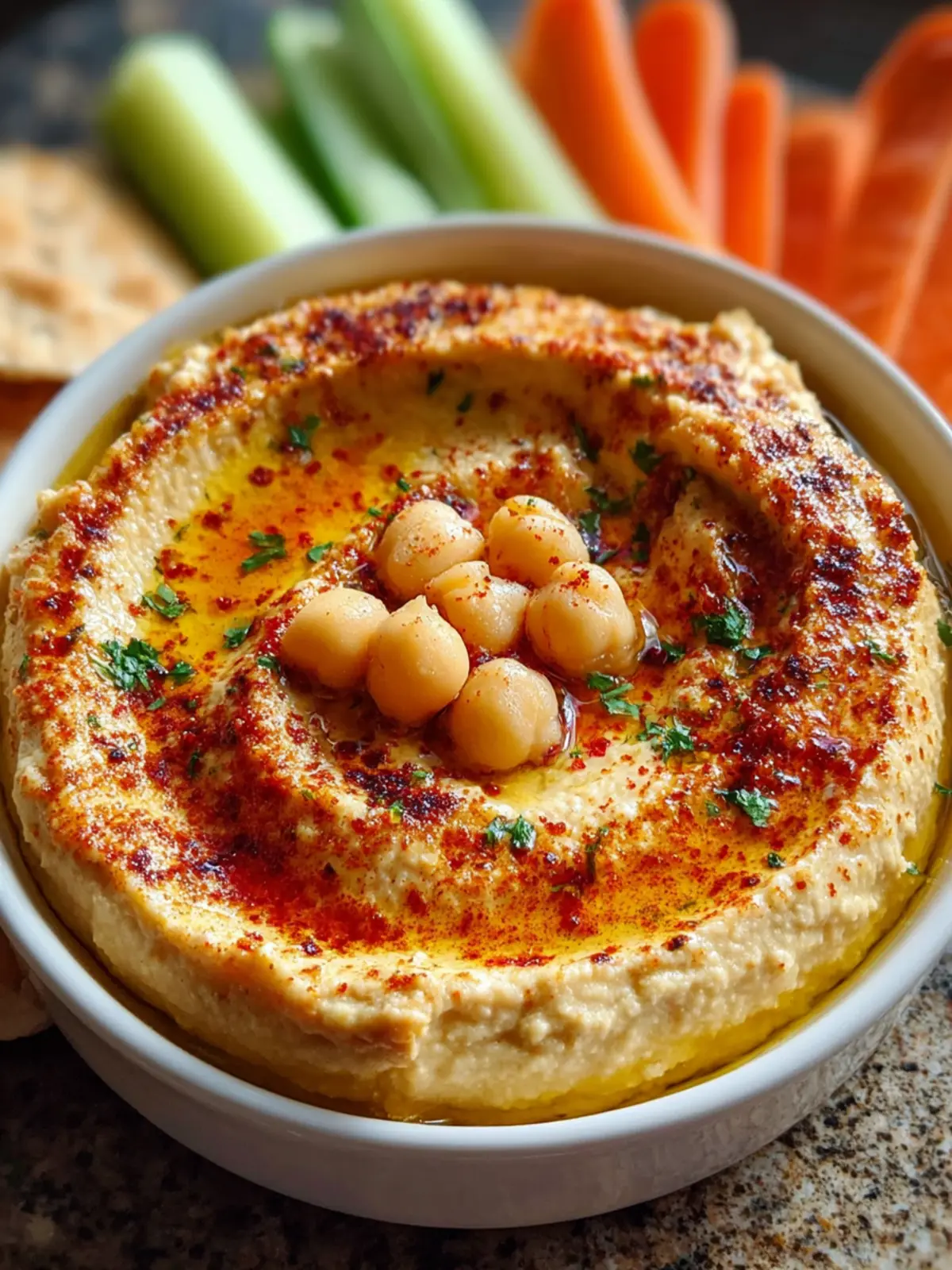 A delicious and creamy chickpea hummus perfect for dipping with vegetables or pita.