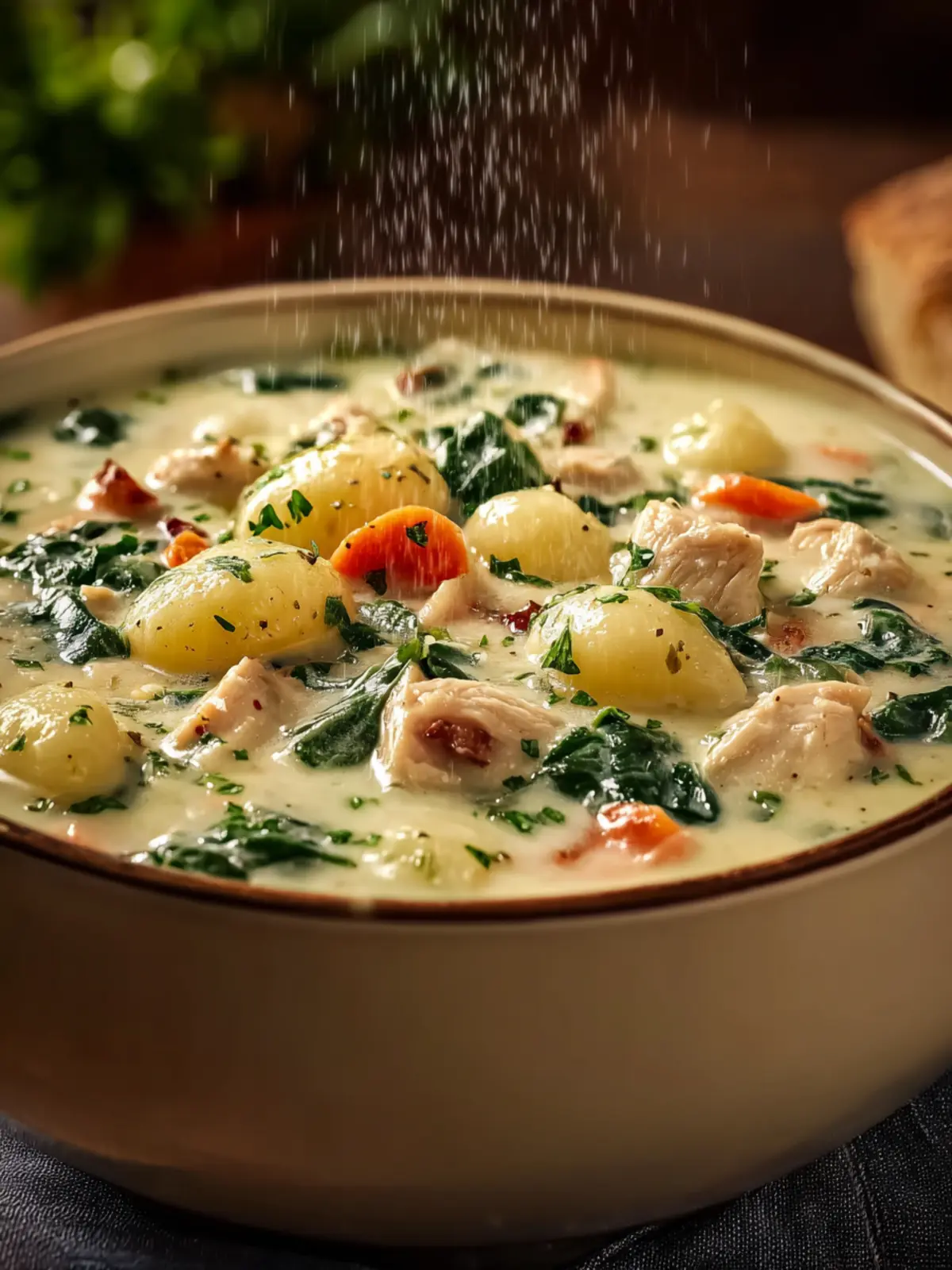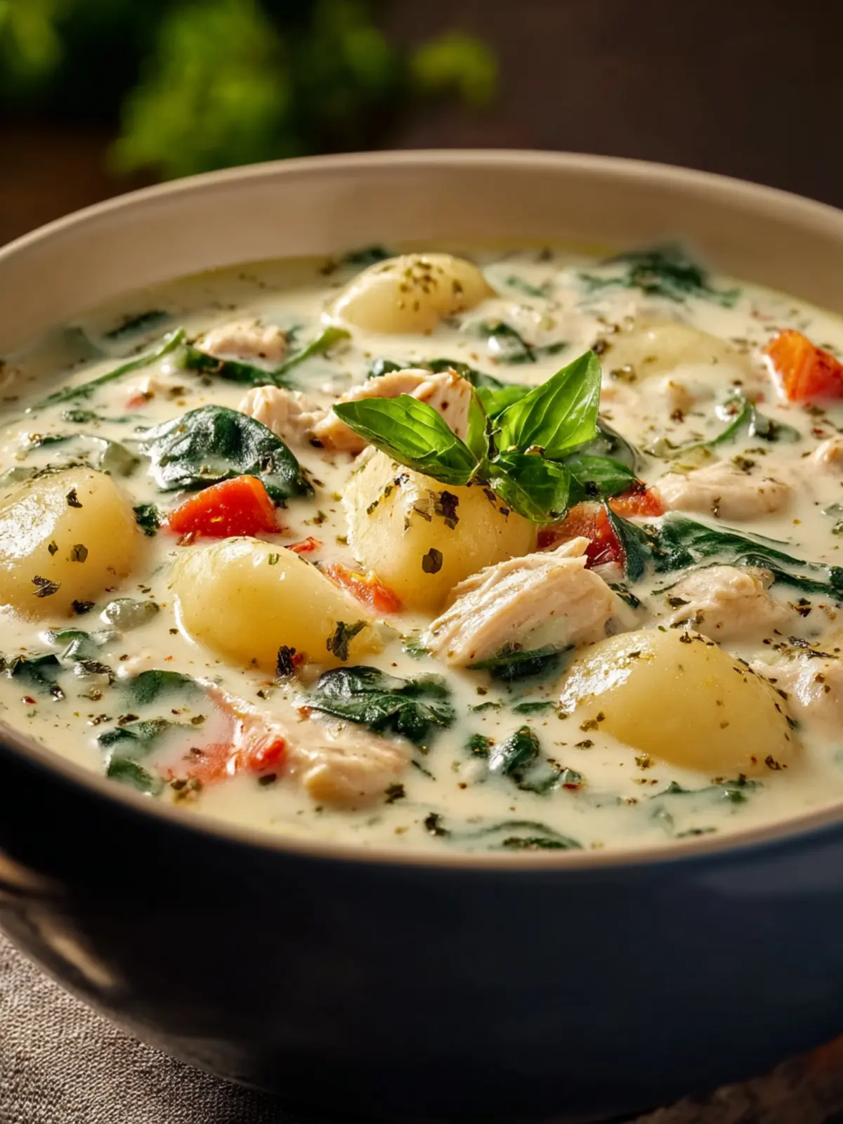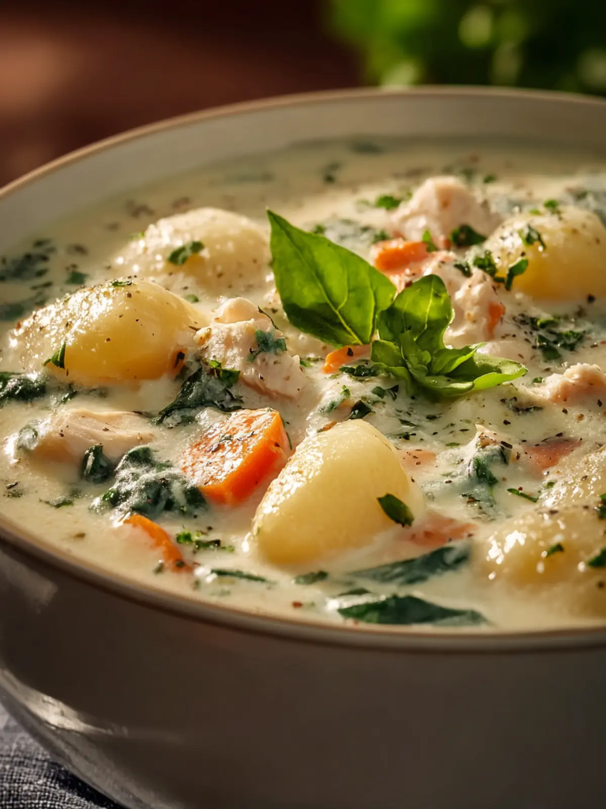 A hearty and comforting creamy soup featuring chicken, gnocchi, and fresh spinach, perfect for chilly days.