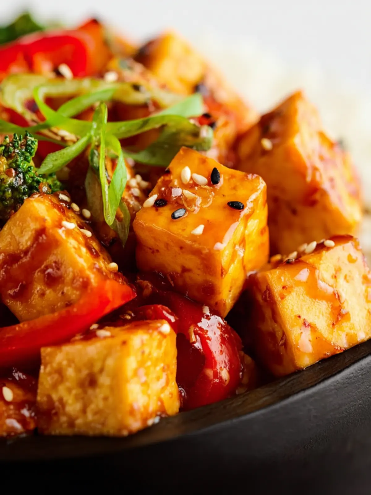 A delicious stir fry featuring extra-firm tofu, vibrant vegetables, and a tangy orange ginger sauce.