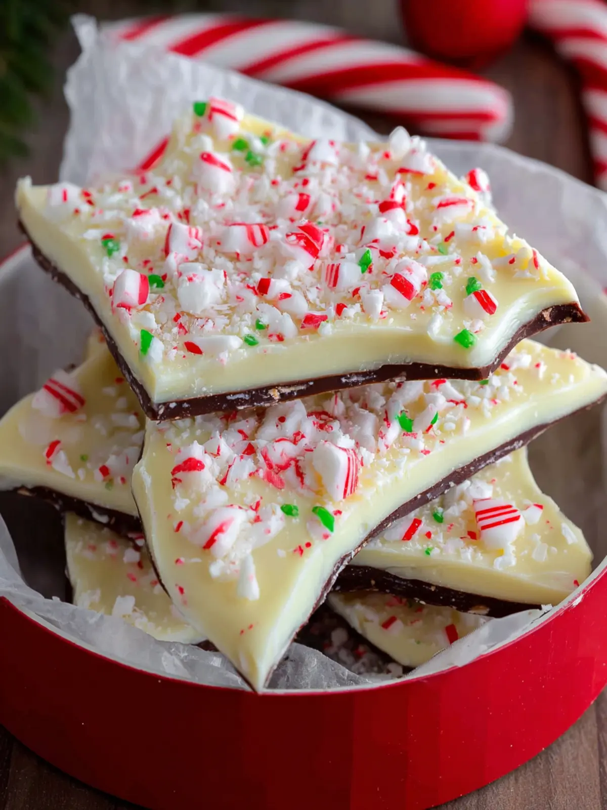 This delicious peppermint chocolate bark is a festive treat perfect for the holidays, combining white and semi-sweet chocolate with crispy candy canes.
