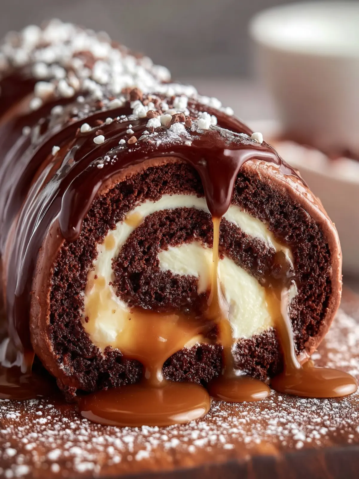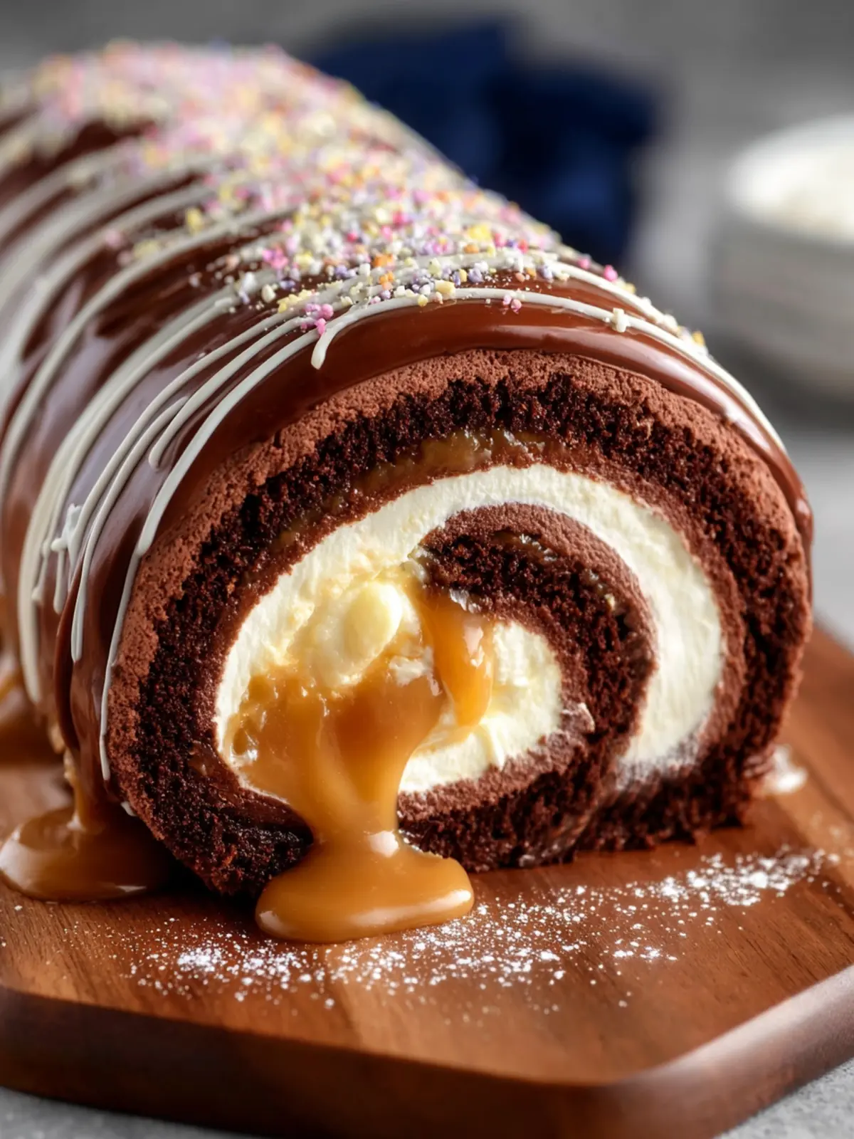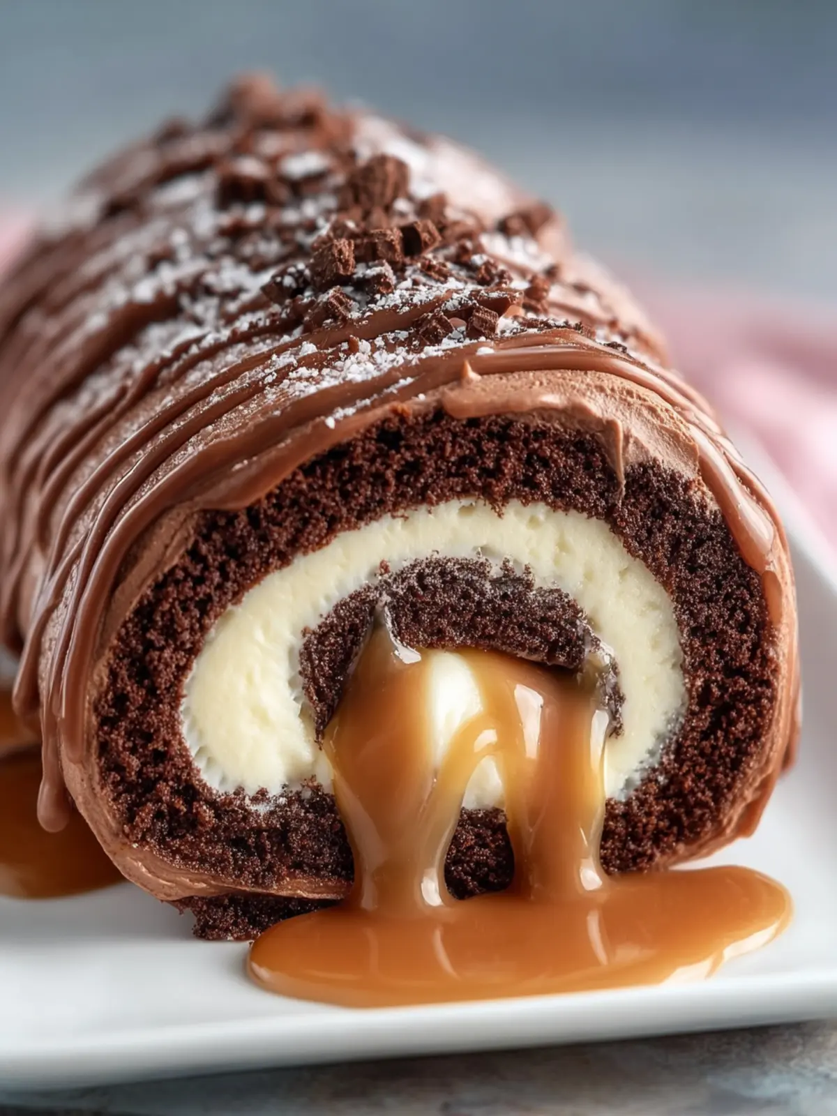 A delightful chocolate sponge rolled with creamy caramel filling and topped with decadent chocolate ganache.