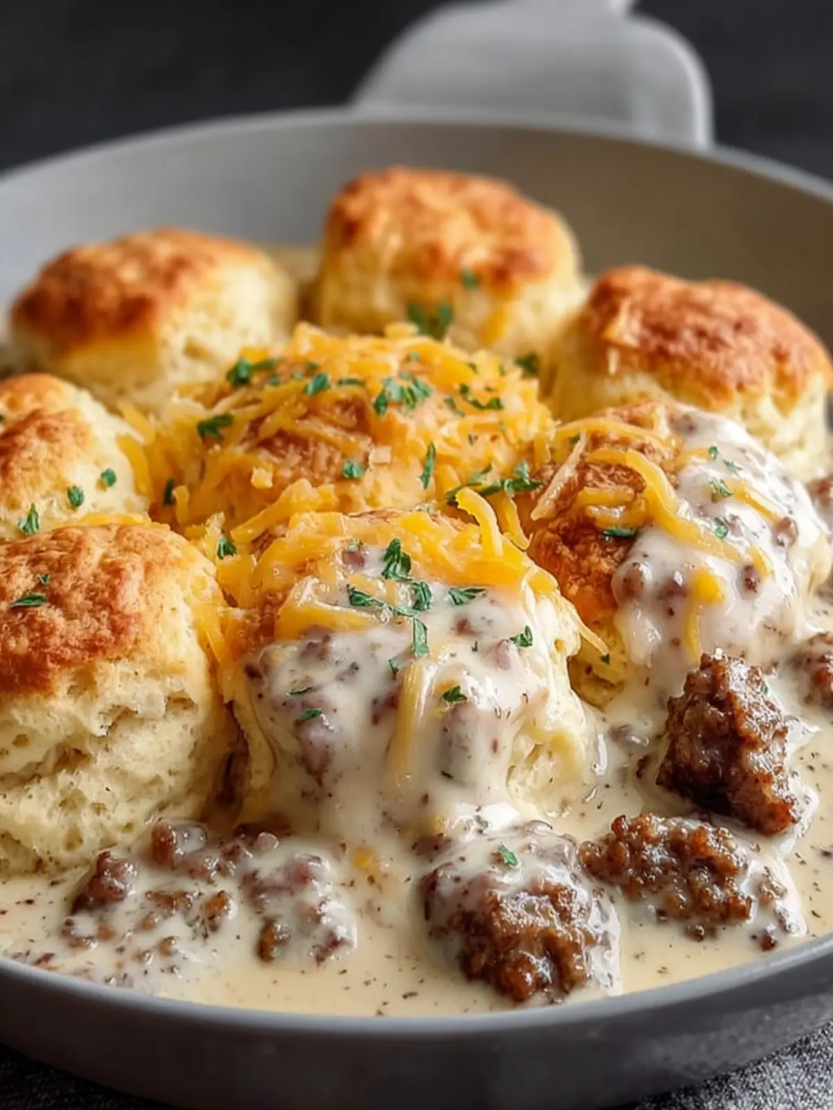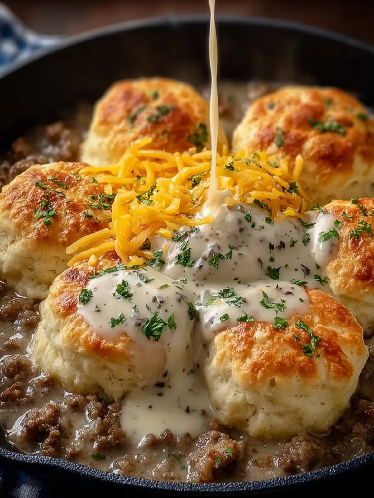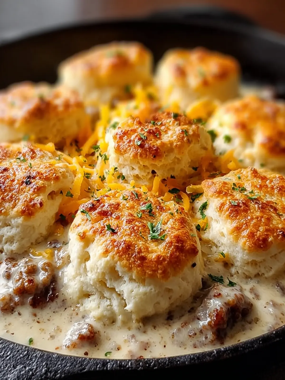 - Assemble in the Skillet: Remove the skillet from heat. Place the biscuits over the sausage gravy.