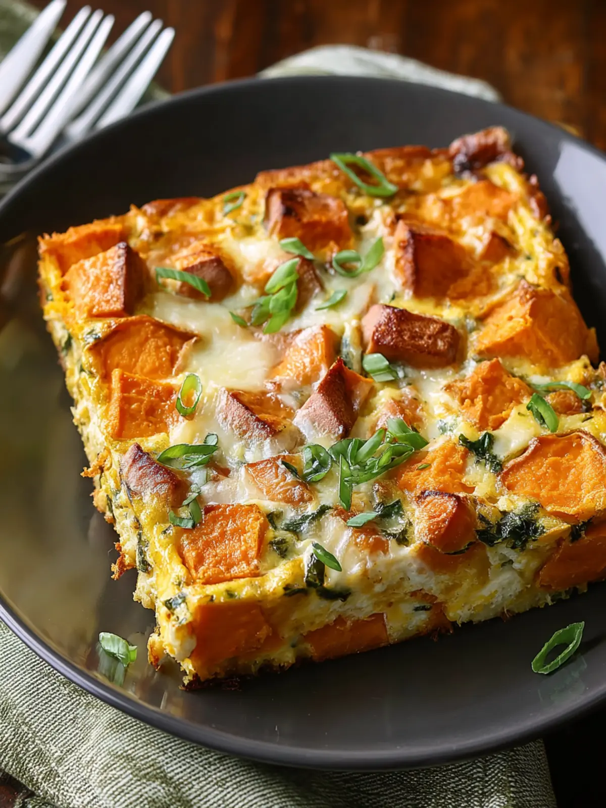 A delicious and healthy egg bake made with sweet potatoes, spinach, and cheese.