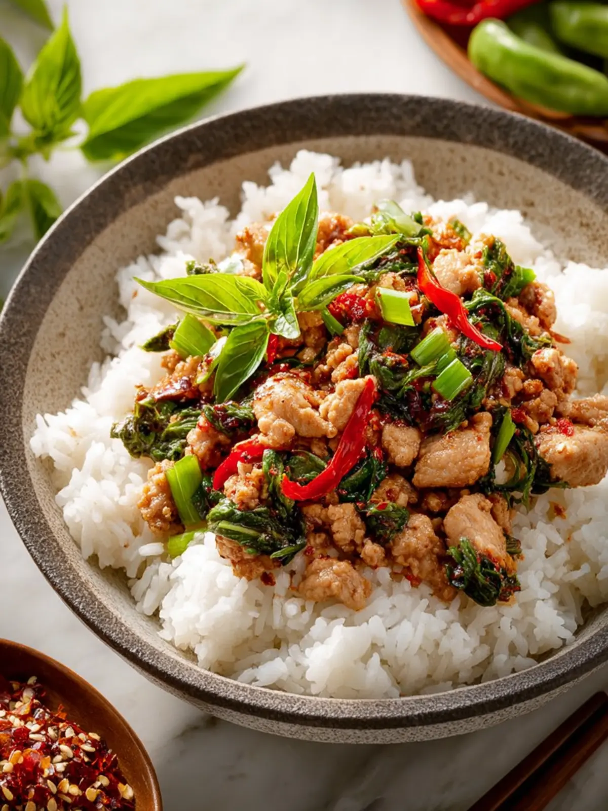 Thai Basil: The star of the dish, Thai basil, offers a spicy, slightly sweet flavor that’s essential for authenticity. Regular basil won’t deliver quite the same punch, so seek out the real thing for that aromatic lift.
