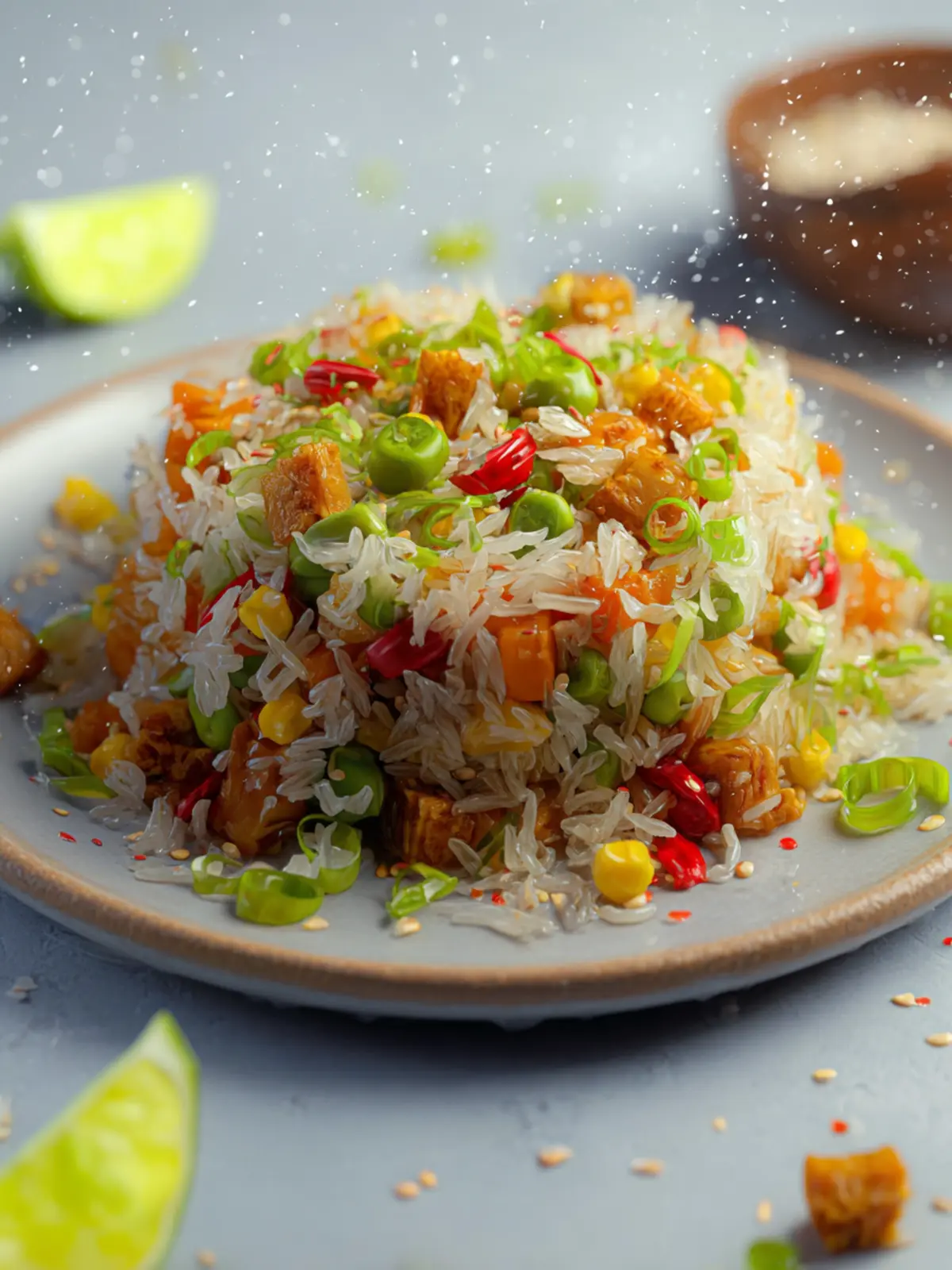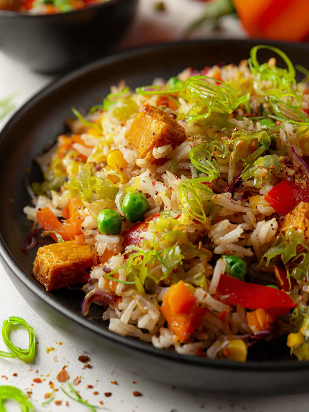 This vegetable smoked tofu rice is a delightful mix of flavors and textures, perfect for a quick and satisfying meal.