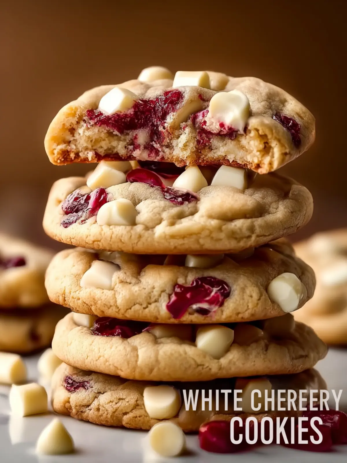 White Chocolate: You can’t forget the star of the show—chunky pieces of white chocolate that melt beautifully during baking. These creamy pockets enhance the cookie experience, offering a rich contrast to the tart cherries and sweet cookie base.